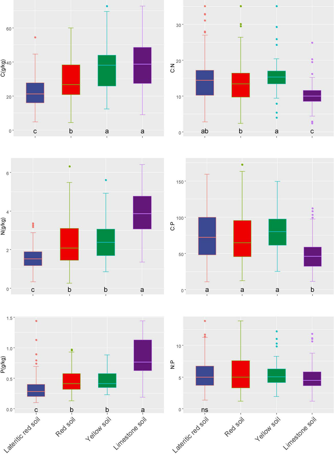 For different soil types, the sequence of C, N, and P contents was limestone soil > yellow soil > red soil > lateritic red soil (Figure 3). The ANOVA results identified that differences were not statistically significant in soil C contents among limestone soil and yellow soil, nor in the relationships with N and P contents among yellow soil and red soil. C, N, and P concentrations showed significant differences across other soil types. In terms of stoichiometric characteristics, limestone soil C:N and N:P ratios were significantly lower than the other soil types. Yellow soil C:N ratios were significantly higher than those of red soil. Other stoichiometric ratios were observed no significant differences among soil types.