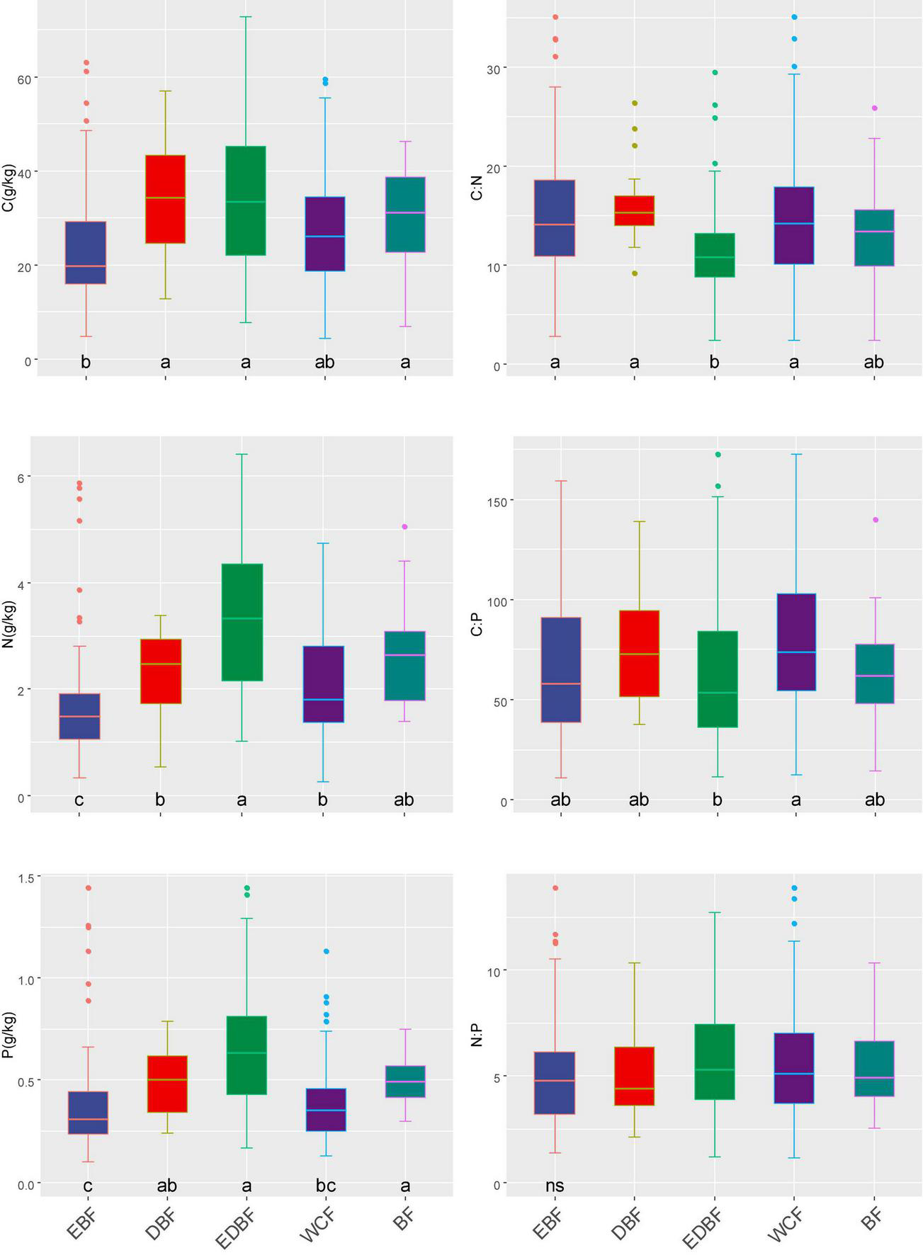 Forest types showed significant influences on soil C, N, P, C:N, and N:P ratios (Figure 4). The EDBF had the highest soil C, N, and P contents, whereas EBF had the lowest soil C and N contents. The lowest P content was in WCF. The content of C in EBF was observed to exhibit significantly lower than that in DBF, EDBF, and BF. Compared to other forest types, the N concentrations in EBF were significantly lower. The content of N in EDBF was observed to exhibit significantly higher than that in DBF and WCF. P concentrations were significantly higher in EDBF and BF than in EBF and WCF. The C:N ratios were significantly lower in EDBF than in EBF, DBF, and WCF. The C:P ratios were significantly lower in EDBF than in WCF.