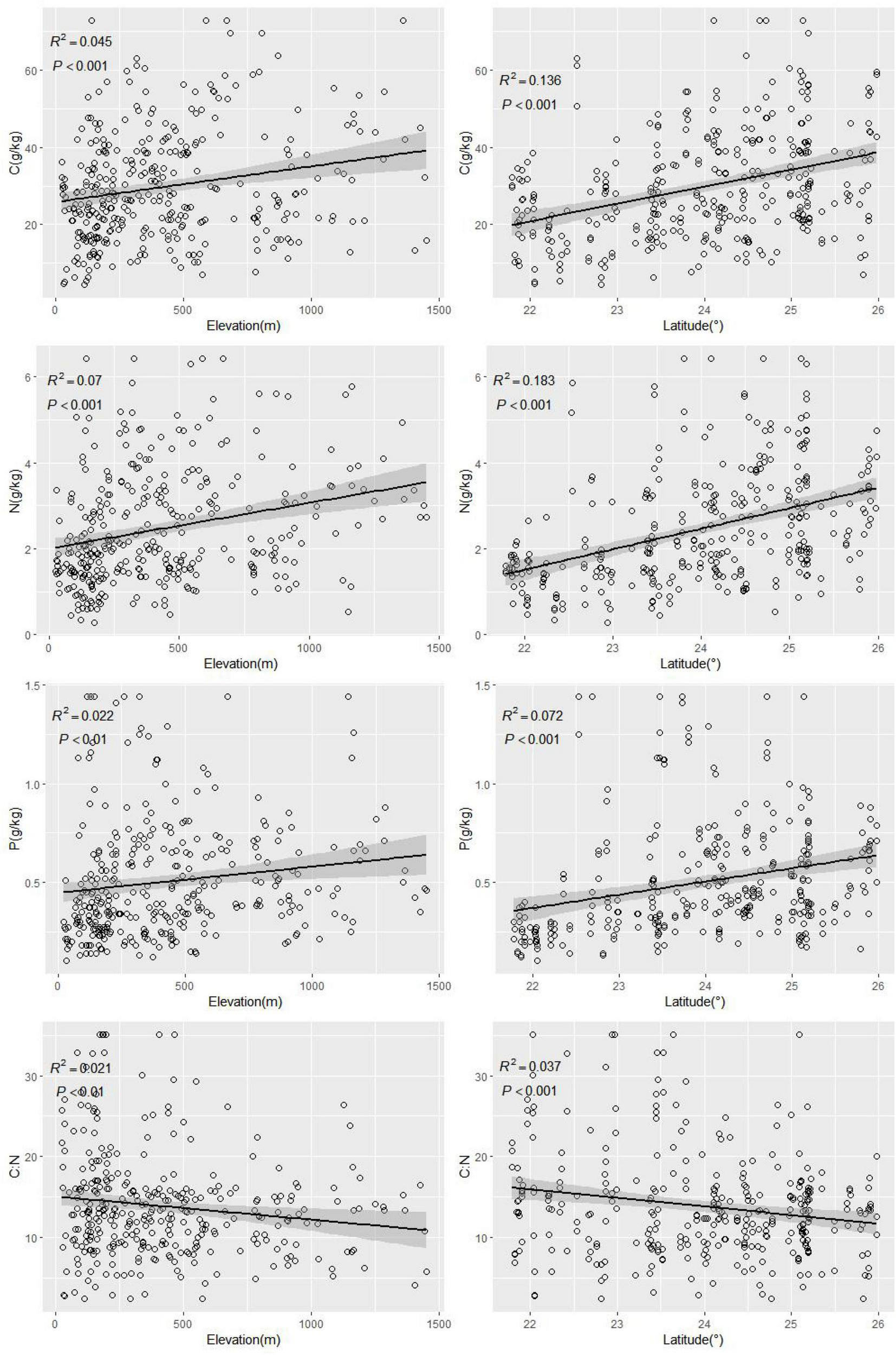 Significant relationships between soil C, N, P, C:N and elevation, latitude.