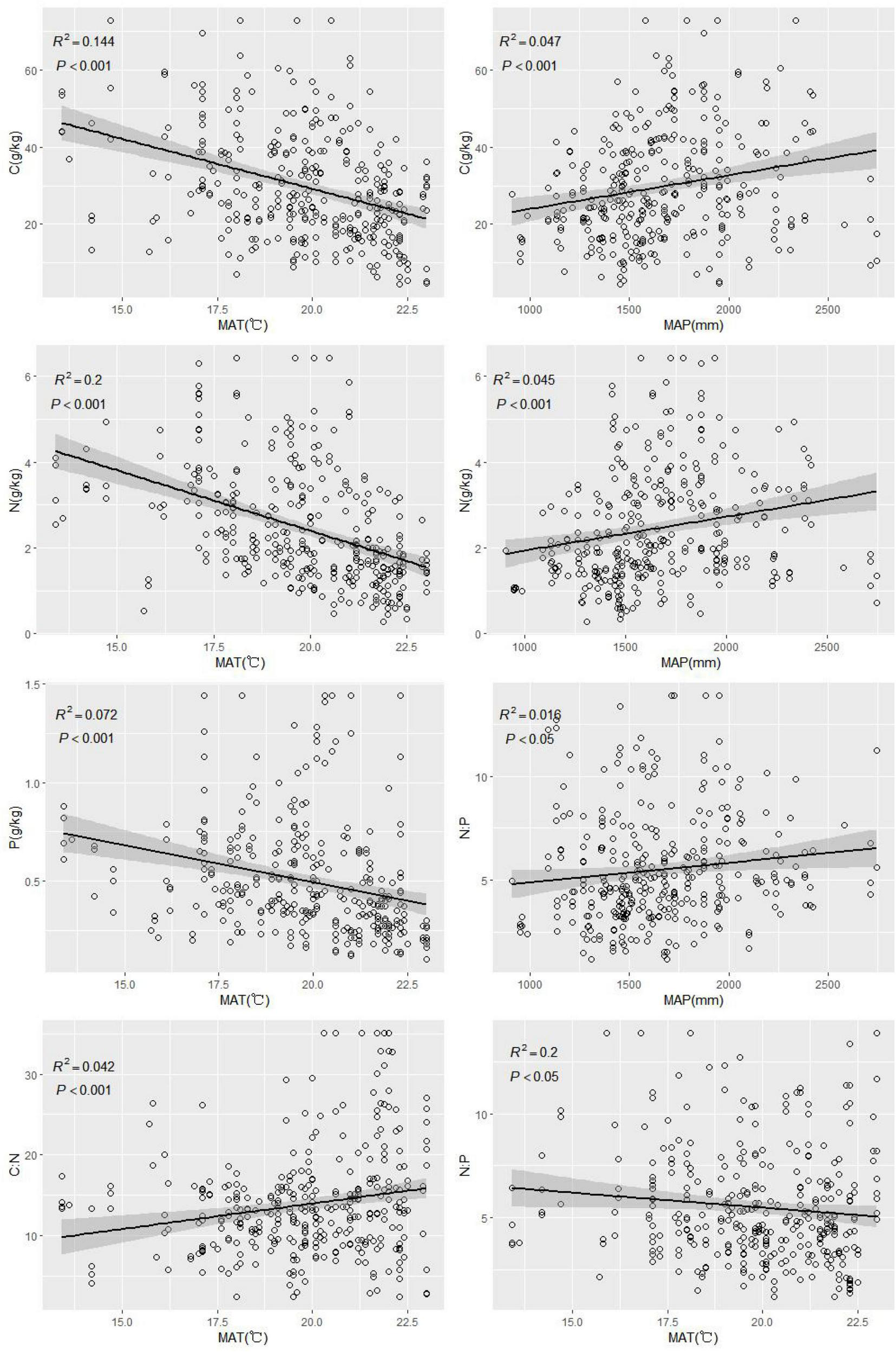 Significant relationships between soil C, N, P, C:N, N:P and MAT, MAP.