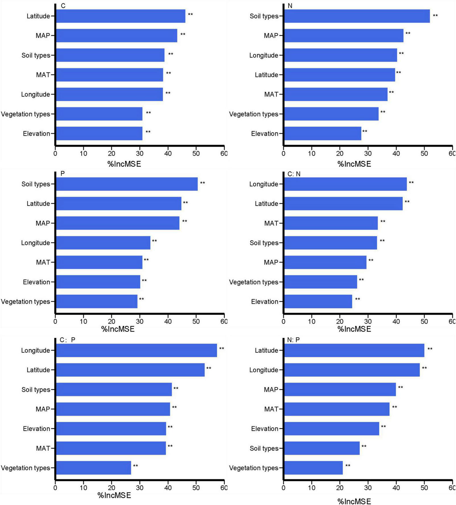 Importance (the relative increase in mean square error, %IncMSE) of variables contributing to soil C, N, P concentrations and their ratios in Guangxi forests.