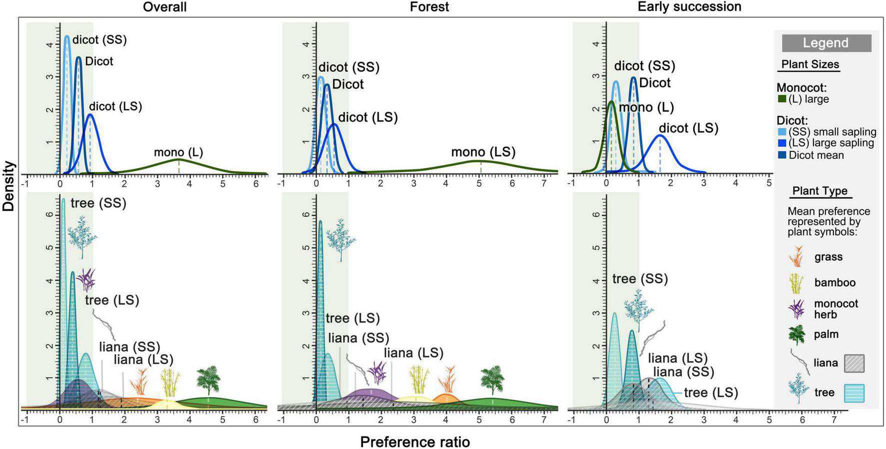Elephant preferences varied by plant and habitat types (Figure 3, Table 1 and Supplementary Table 6). Overall, elephants showed a strong preference for palms (PR = 4.6), while they avoided trees (PR = 0.39). In the forest, elephants showed a strong preference for monocots (PR = 5.1) over dicots (PR = 0.33). Large palms (PR = 5.4) and large liana saplings (PR = 2.4) were the most preferred categories, whereas large tree saplings were harvested more selectively (PR = 0.36). In early successional habitats, elephants showed neither preference nor avoidance for dicots (PR = 0.84). Specifically, they showed a preference for large tree saplings (PR = 1.6), and avoided small tree saplings (PR = 0.25). As plants below 1 m were not sampled in the early successional habitats, the sample sizes of certain plant categories were too small to provide preference estimates or provided low-reliability estimates (as reflected by simulated negative credible intervals; Figure 3 and Supplementary Table 5).