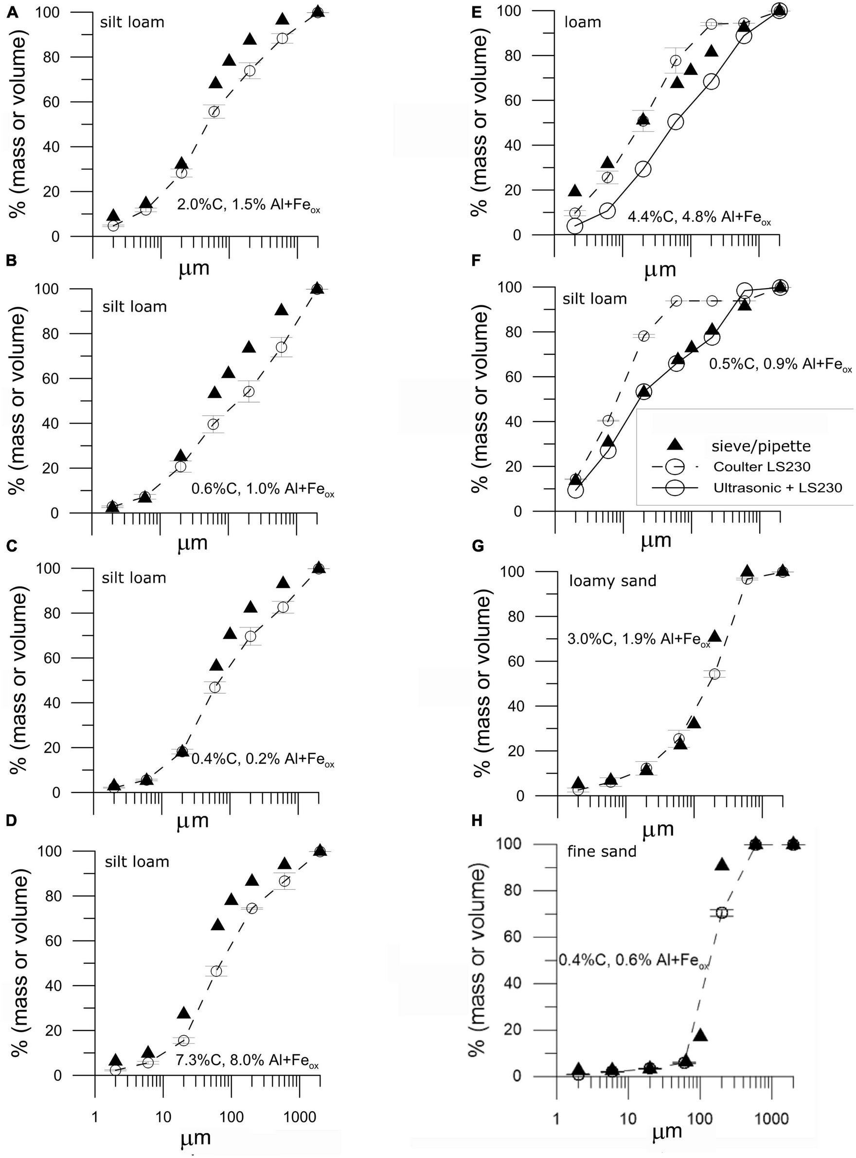 Figure 3. Cumulative content of fractions of fine earth particles vs. particle size. The Lithuanian (Lit) samples were sieved at 1 mm before laser diffraction (LD) measurement on Coulter LS230, and received no external ultrasonication (see Table 1). Each LD point is the mean of three samples (N = 3) and error bars are 1 SD for the fraction up to the given diameter. Sample numbers refer to Supplementary Table 1. (A) Lit1, (B) Lit3, (C) Lit5, (D) Lit7, (E) Lit9, (F) Lit10, (G) Lit11, (H) Lit12.
