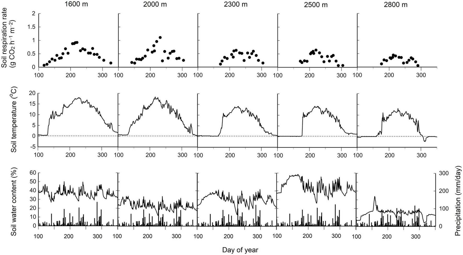 Seasonal changes in soil respiration rates (top row), soil temperature (middle row), volumetric soil water content (bottom row, lines) at a depth of 5 cm, and daily precipitation (bottom row, bars) at five elevations in 2019 on Mt. Norikura, central Japan. The elevation is 1600, 2000, 2300, 2500, and 2800 m from the left to the right for each row of five panels. The day of the year (X axis) is depicted between 100 and 350 for each panel.