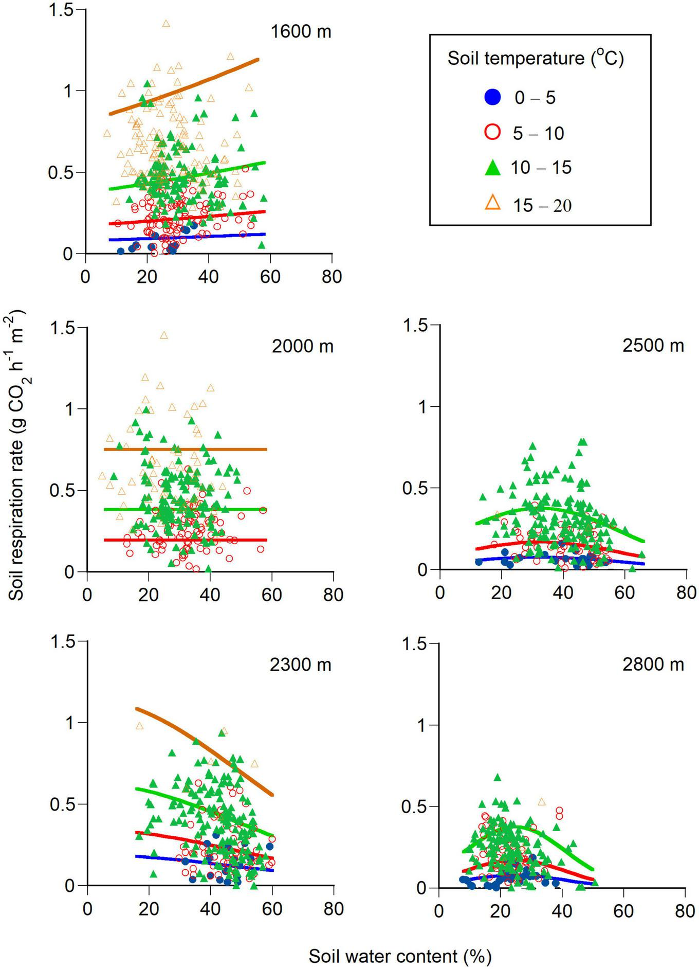 Changes in soil respiration rates with soil temperature and soil water content at a depth of 5 cm at five elevations (1600, 2000, 2300, 2500, and 2800 m). The soil respiration rate was calculated using Equation 2 in the main text for the three or four soil temperature conditions (0-5.0, 5.1-10.0, 10.1-15.0, and 15.1-20.0°C) at each elevation. See Table 1 for equation parameters (the measurement year was set as 2015). An average soil temperature was used to draw a regression line (Equation 2) for each soil temperature condition at each elevation (i.e., 3.6, 7.9, 12.5, 16.4°C at 1600 m, 8.0, 12.8, 16.2°C at 2000 m, 4.3, 7.7, 12.6°C at 2300 m, 3.5, 7.2, 11.7°C at 2500 m, and 3.5, 7.7, 11.6°C at 2800 m).