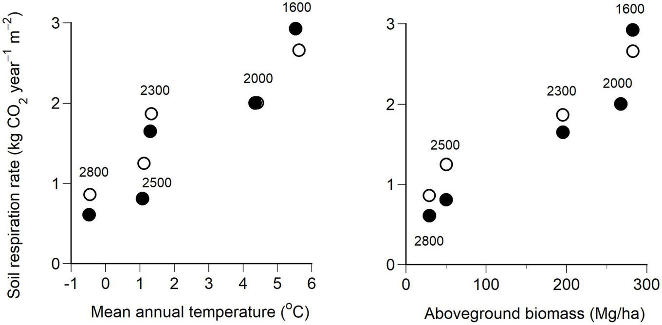 Relationships of annual soil respiration rates with mean annual temperature (left) and aboveground biomass (right) at the five elevations (1600, 2000, 2300, 2500, and 2800 m) for the 2 years, 2018 (●) and 2019 (○). The annual soil respiration rate was estimated by substituting hourly soil temperature and soil water content into Equation 2 in the main text. See Table 1 for the equation parameters. The unit of Mg/ha is equivalent to × 0.1 kg/m2.