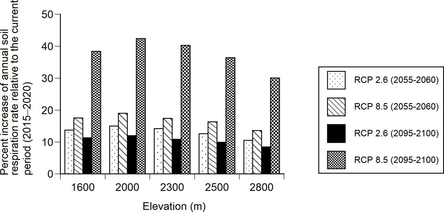 Percent increases in annual soil respiration rates for the two future periods, 2055–2060 and 2095–2100, relative to the current period (2015–2020) at the five elevations (1600, 2000, 2300, 2500, and 2800 m). Annual soil respiration rates were estimated using Equation 6 and two climate change scenarios (RCP 2.6 and RCP 8.5).