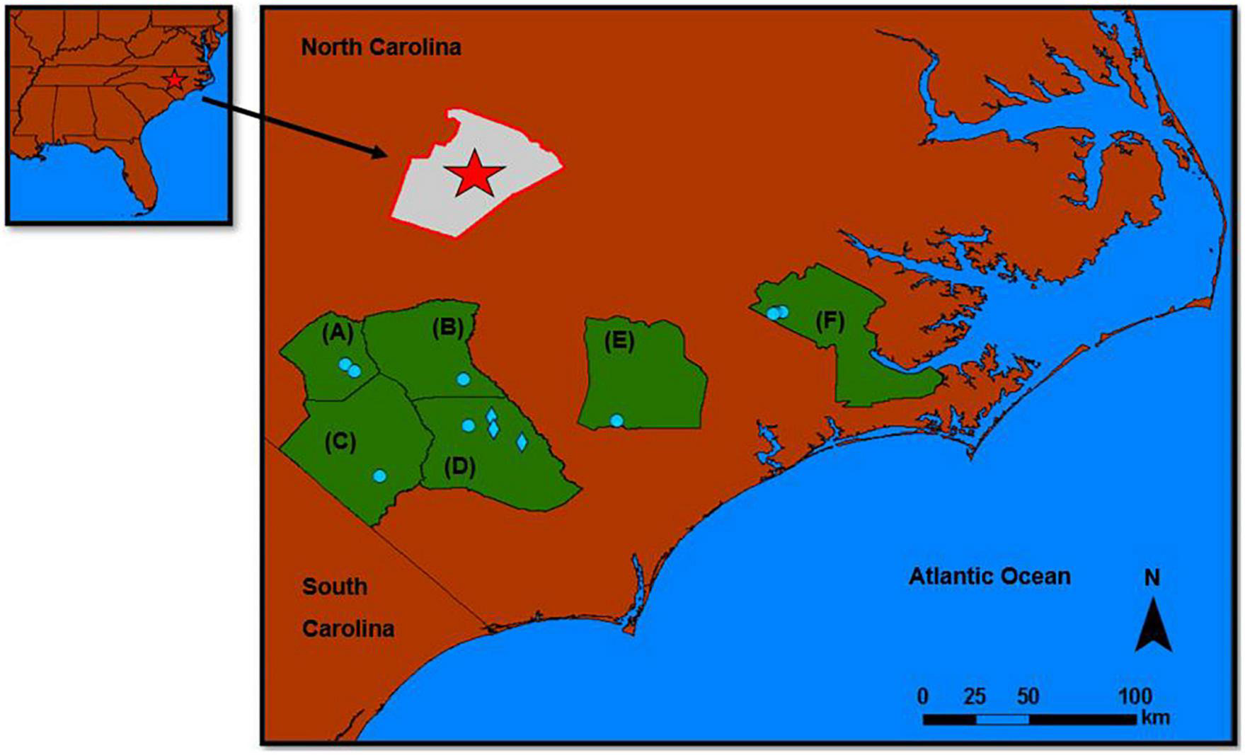 Locations of the Carolina Bay research sites in relation to Raleigh, NC (red star). Mitigation sites are shown as blue circles and reference sites are shown as blue diamonds. (A) Hoke County–Arabia Bay and Hillcrest Bay, (B) Cumberland County–Barra Farms (Harrison Bay), (C) Robeson County–Juniper Bay, (D) Bladen County–Dowd Dairy and Reference Bays (Causeway, Charlie Long-Millpond, and Tatum-Millpond Bays), (E) Duplin County–Twin Bays, and (F) Craven County -Dover Bay and Sliver moon 1 and 2.