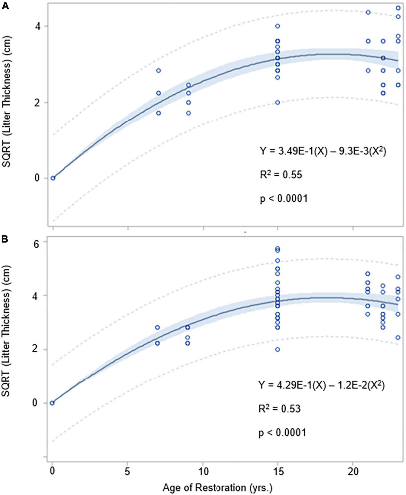 Changes in litter thickness over time are shown in Figure 2, and in Supplementary Tables 1, 2. Data were best fit with a 2nd-order polynomial term using a square root transformation. All models were significant at the 0.05 level or higher. Regression results were similar for Hydrologic Groups 1 and 2 and their data were combined in Figure 2A. Regression results were similar for Hydrologic Groups 3 and 4 and the data for these were combined as well in Figure 2B. For all Hydrologic Groups, litter thickness progressively increased up to approximately 15 years following restoration, and then remained nearly constant thereafter. Canopy closure probably occurred at about 15 years which maximized annual litter production.