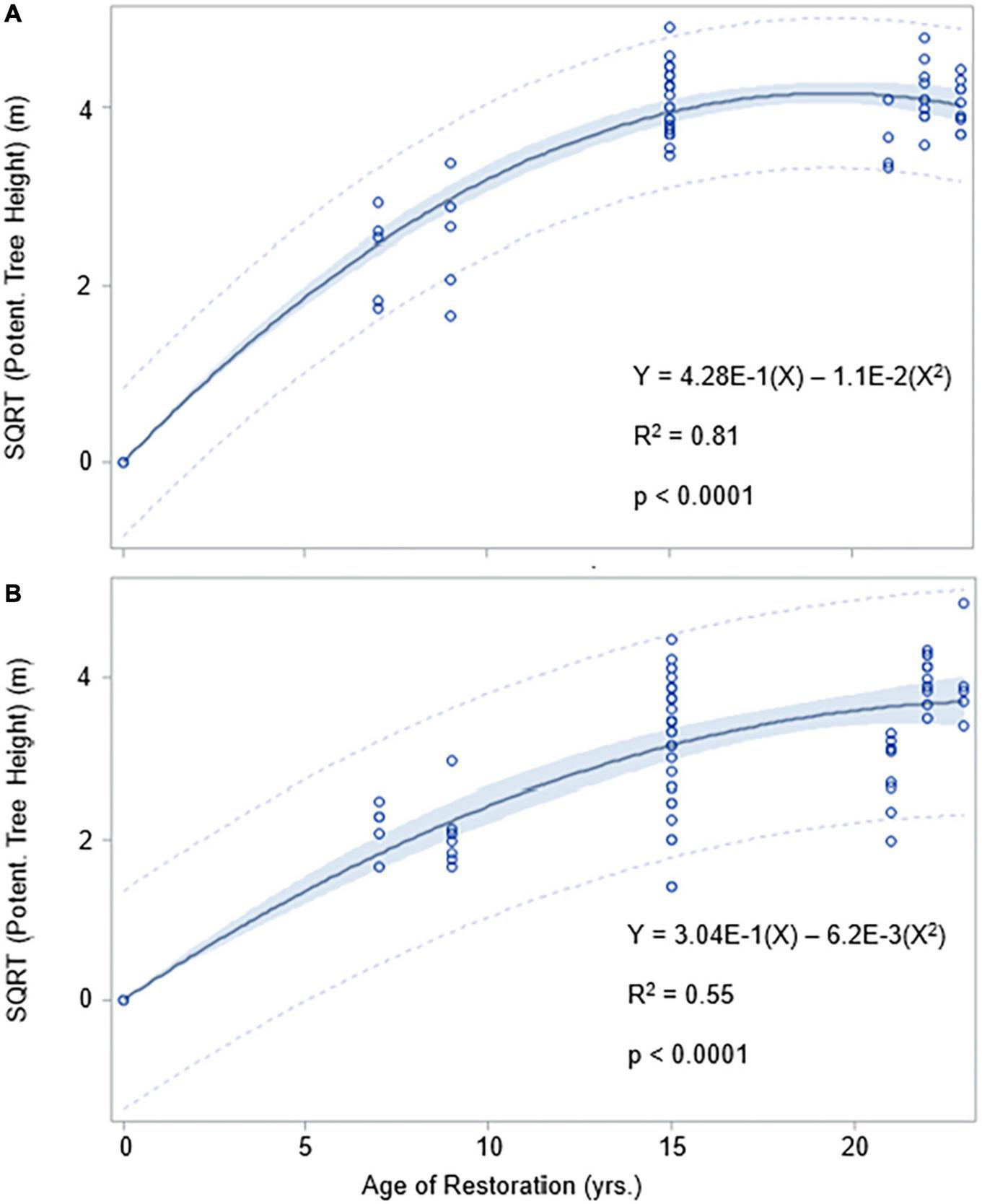 Changes in potential tree height over time are shown in Figure 4, and in Supplementary Tables 1, 2. Similar curvilinear relationships were found for Hydrologic Groups 1 and 2, and for Groups 3 and 4. The potential tree height peaked at approximately 15 years reaching values of about 17 m (Groups 1 and 2) and 12 m (Groups 3 and 4).