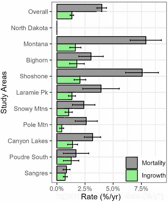 The annualized mortality rate for limber pine was about 4%/year overall and ranged from <1%/year in the Sangre de Cristo Mountains to 8%/year in Montana (Figure 2). Ingrowth recruitment rates were lower than mortality rates overall (∼1.25%) and in every study area. Ingrowth recruitment rates also had a narrower range than mortality rates from the lowest on Pole Mountain at <1% to the greatest on the Shoshone NF at ∼2%.