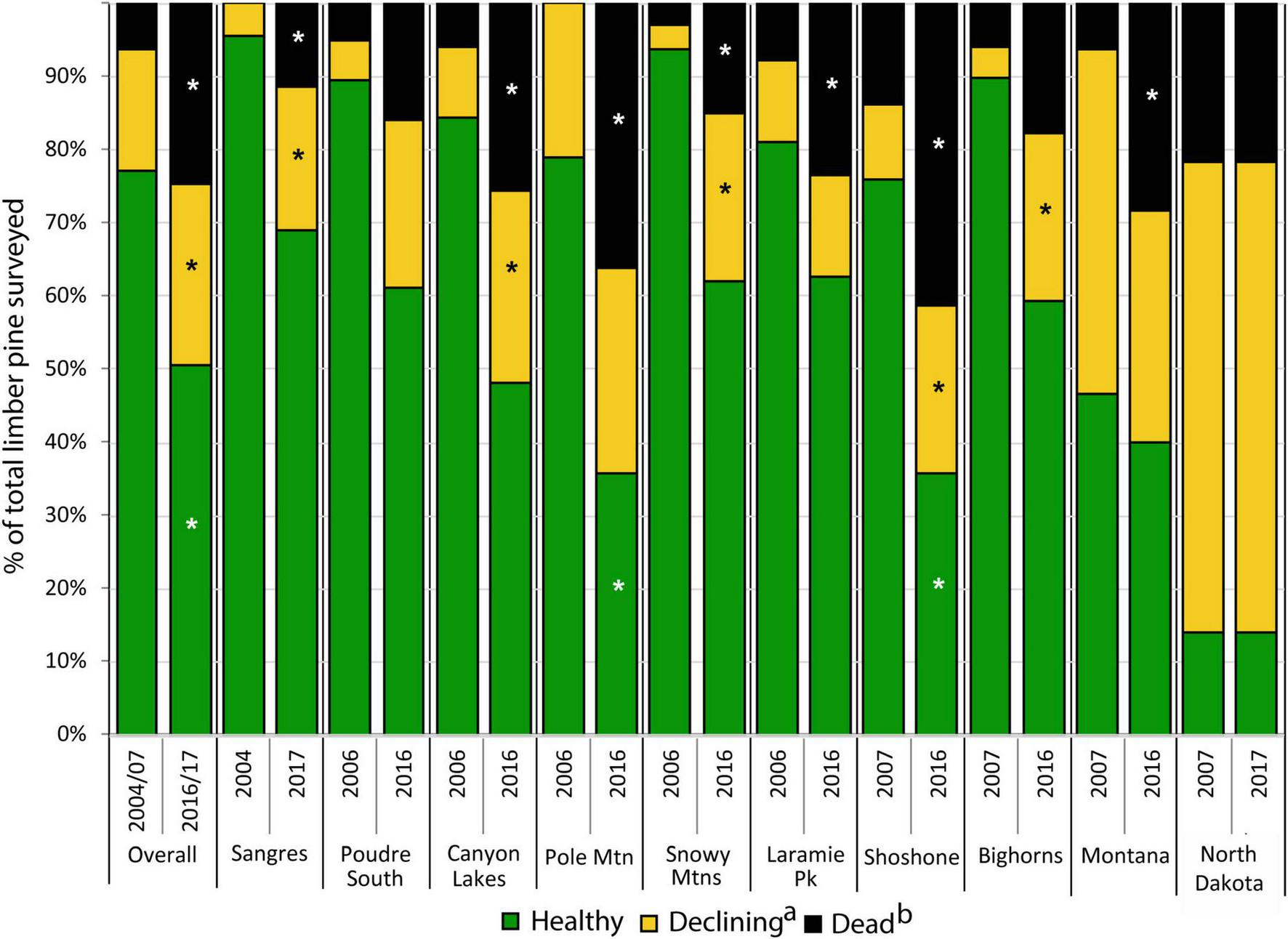 Changes in the health status of limber pine trees (>1.37 m tall) from 2004–2007 to 2016–2017 overall and within 10 study areas (a) includes all trees classified as declining or dying; (b) includes all trees classified as recent dead and old dead. Dead trees not measured in the Sangre de Cristos in 2004–2007. Asterisks represent significant change (P < 0.05) using paired t-test from 2004–2007 to 2016–2017 within study areas.
