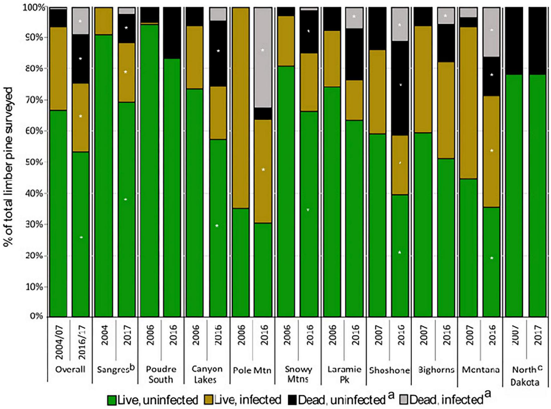 During the first measurement, 6% of all limber pines were standing dead (Figures 3, 4). Of the 70 recently killed trees assessed at the start of the study (cause of death not evaluated for old dead trees), 49% were killed by bark beetles with no evidence of WPBR, 9% were killed by bark beetles and were infected with WPBR, and 4% were killed by WPBR (Table 1). At that time, bark beetle mortality was detected in all study areas except Poudre South, Pole Mountain, and North Dakota. Mortality attributed to WPBR was only detected in Montana at the start of the study (Table 1). Mortality increased significantly overall and in most study areas from start to end (Figure 3) and the percentage of dead trees that were infected with WPBR increased significantly overall, and in most study areas (Figure 4; Pole Mountain, Laramie Peak, Shoshone, Bighorn, and Montana; data unavailable for Sangre de Cristos).
