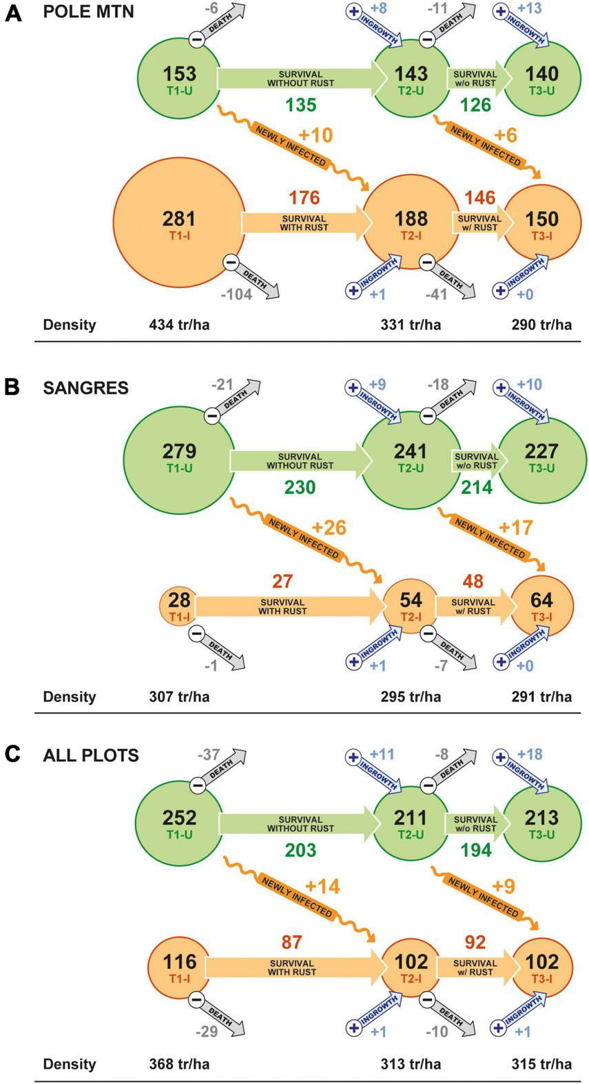 Plots were distributed across a variety of aspects, slopes, and slope positions and were located between 884–3,119 m (2,900–10,243 ft) elevation (Supplementary Table 2). When the study began, 7,174 (6,884 live) standing trees were assessed including 3,863 (3,623 live) limber pines (Supplementary Table 2). During the final assessment, plots contained 8,129 (6,461 live) standing trees, of which 4,176 (3,141 live) were limber pine (Supplementary Table 2). Plots had 34 (range 1–169) and 30 (range 1–162) live, limber pines on average at the start (2004–2007) and end (2016–2017) of the study, respectively. The percentage of plots with Ribes spp. present increased from 54 to 66% over the study. Other alternate hosts (Castilleja spp. and/or Pedicularis spp.) were present in 37% of plots during the final measurement cycle (data not collected in earlier measurements) (Supplementary Table 1).