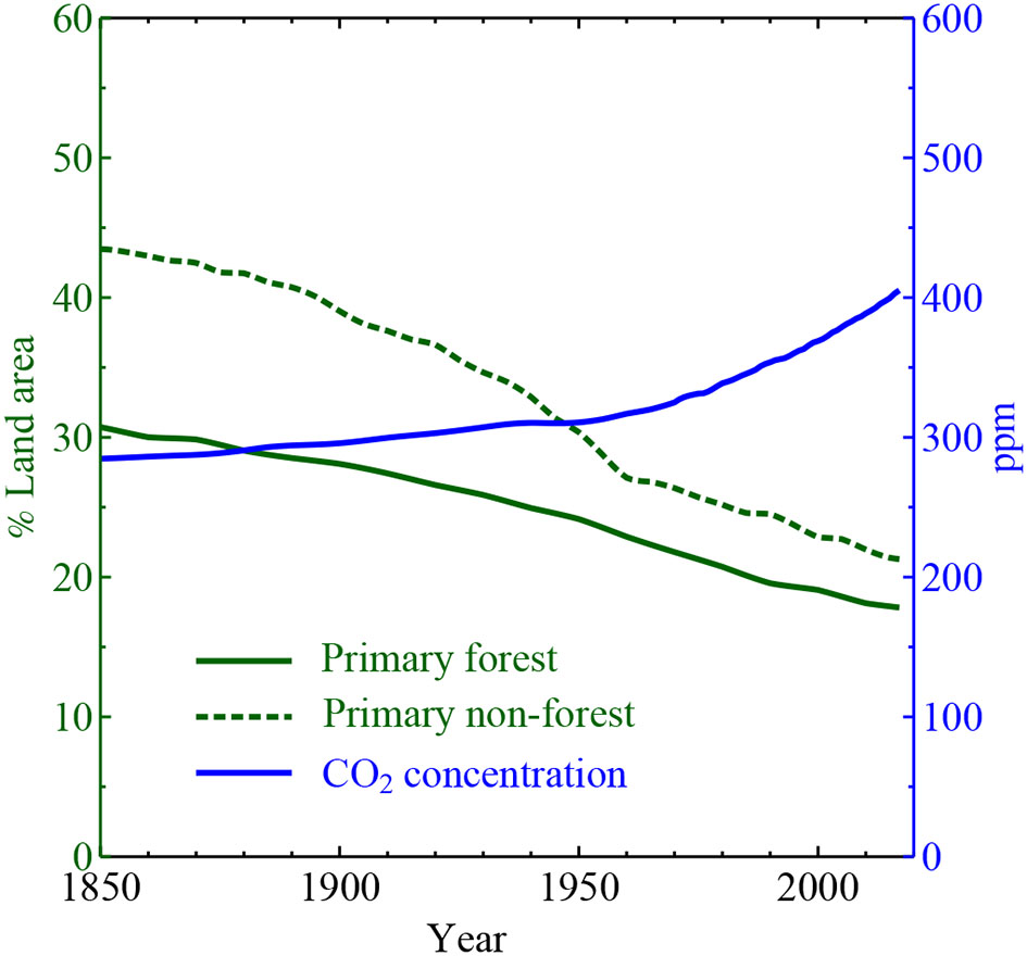 Decline of primary forest and non-forest ecosystems (left axis, data from Hurtt et al., 2020, their Figure 7) and increase of atmospheric CO2 (right axis, data downloaded from https://www.eea.europa.eu/data-and-maps/daviz/atmospheric-concentration-of-carbon-dioxide-5). During the industrial era, primary ecosystems have declined, and CO2 concentration has grown, by approximately one half.