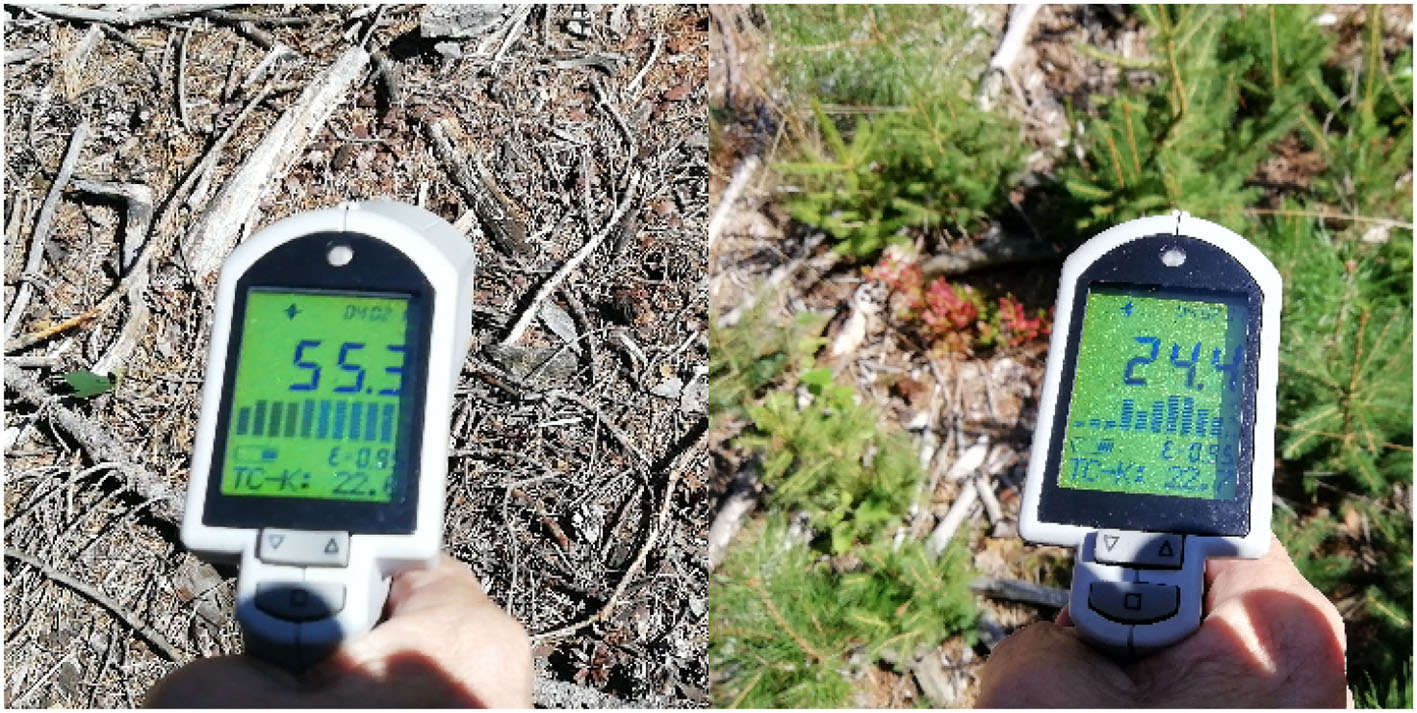 Local cooling from plant transpiration. With incoming solar radiation of about 1 kW m−2, dry area on the deforested plot (left) has temperature of 55.3°C. Young transpiring trees (right) lower the surface temperature by almost 30°C. Distance between the two spots is 1 m. Measurements and photo credit Jan Pokorný.