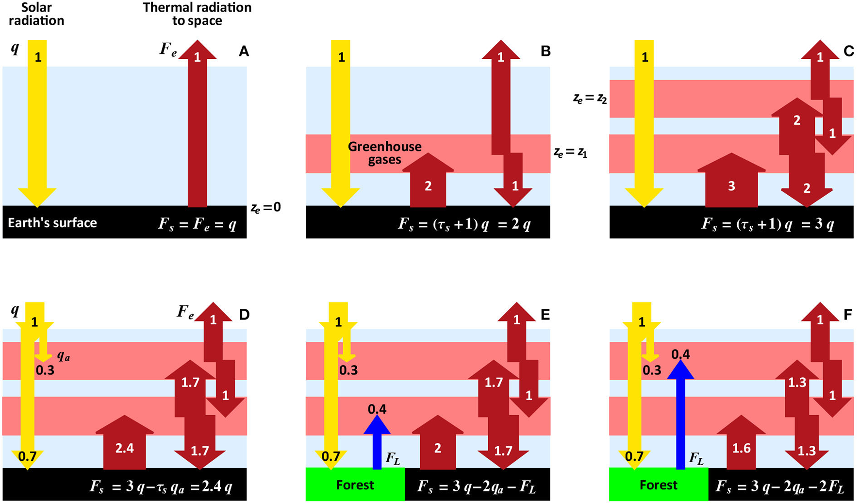An increase in the non-radiative flux FL (from FL = 0 in Figure 3D to FL≃0.4q > 0 in Figures 3E, F) decreases surface thermal radiation Fs by a magnitude proportional to the flux change ΔFL and to the number Δτ of absorbing layers beneath the height where this flux dissipates to thermal radiation (Δτ = 1 in Figure 3E and Δτ = 2 in Figure 3F). Historical deforestation affected about 13% of land area km2 (or 3.8% of planetary surface km2) (Figure 1). With the global mean latent flux of FL = 80 W m−2, if deforestation has reduced this flux by thirty per cent (ΔFL ~ −0.3FL), this could increase the surface radiation by −0.038ΔFLΔτ ~ 0.9 W m−2 (cf. Figures 3D, E, Δτ = 1) or twice that number (cf. Figures 3D, F, Δτ = 2), Table 1. Given an equilibrium climate sensitivity ε ~ 1 K/(W m−2) (Zelinka et al., 2020), the latter case corresponds to a warming of about two degrees Kelvin (Table 1). If the optical thickness of the atmosphere, and, accordingly, the magnitude of Δτ, is greater, the cooling can be proportionally larger.