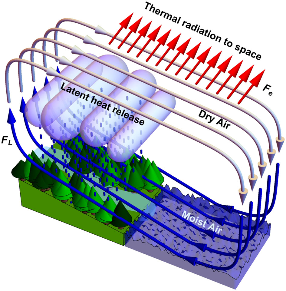 Visualization of the link between transpirational cooling and air circulation. After latent heat is released upon condensation, this energy can be radiated to space while the air travels back to the ocean in the upper troposphere.