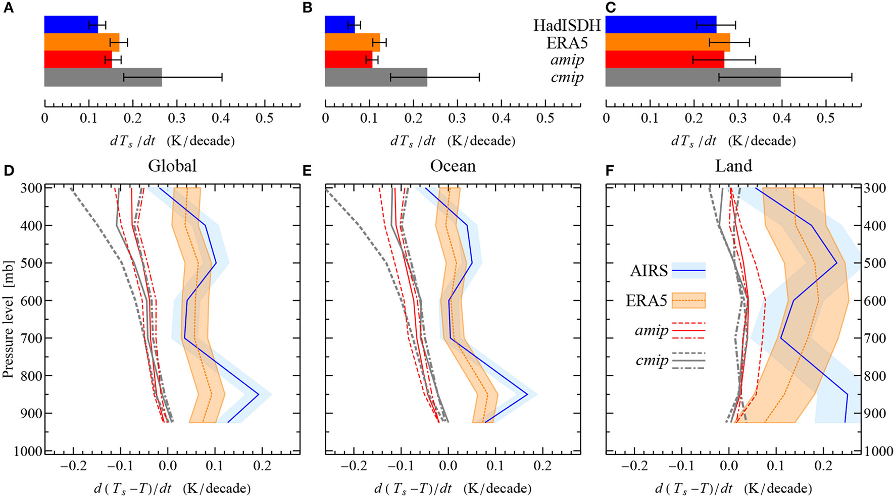Mean trends of the surface temperature Ts(A–C) and of the temperature difference (Ts−T) between the surface and atmospheric pressure levels (D–F) for the planet as a whole (A, D), ocean (B, E), and land (C, F) over 1988–2014 in models (amip, cmip) vs. observations (AIRS, HadISDH, ERA5). In (A–C), whiskers for HadISDH and ERA5 indicate ± one standard deviation, for amip and cmip—the maximum and minimum values. Shading in (D–F) indicates ± one standard deviation. Dashed, solid and dash-dotted model curves in (D–F) were obtained, respectively, by using the maximum, median and minimum values of dTs/dt and dT/dt in the model ensembles (amip and cmip). Data from Supplementary Figure S4 of Allan et al. (2022): AIRS, Atmospheric Infrared Sounder satellite data (Tian et al., 2019); HadISDH, The Met Office Hadley Centre homogenized and quality controlled, integrated sub-daily data set (Willett et al., 2014); ERA5, the fifth generation European Center for Medium-range Weather Forecasts global reanalysis (Hersbach et al., 2020); amip, Atmospheric Model Intercomparison Project, atmosphere-only simulations (without the ocean-atmosphere feedbacks in the climate system) (Gates et al., 1999); cmip, Phase 6 of the Coupled Model Intercomparison Project (includes amip simulations as an integral part) (Eyring et al., 2016). See Allan et al. (2022) for further details. In (D–F), d(Ts−T)/dt for AIRS is calculated using HadISDH dTs/dt. Note that altitude z(p) of a given pressure level p increases slightly as the surface temperature grows, but for p <300 mb it is a minor effect compared to the increase of the temperature difference Ts−T(p).
