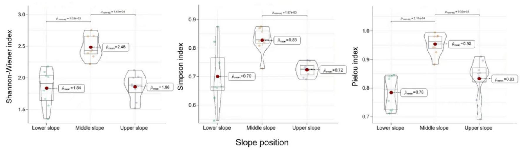 Changes in Shannon–Wiener index, Simpson index, and Pielou index of the herbs in response to slope position variation.