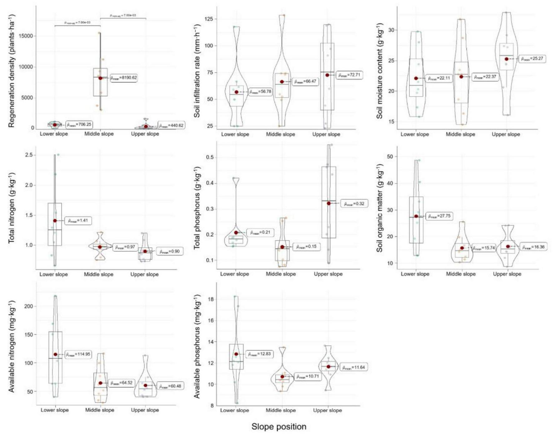 As predicted, different distributions of the data were observed in most soil chemical properties across the three slope positions by the violin plots (Figure 4 and Appendix Table 1). Soil organic matter, total nitrogen, and available nitrogen exhibited similar distributions, with higher concentrations at the lower slope and lower concentrations at the upper slope. Mean soil organic matter values from lower to upper slope were 27.75, 15.74, and 16.36 g/kg, respectively. Mean total nitrogen values were 1.41, 0.97, and 0.90 g/kg, and mean available nitrogen values were 114.95, 64.52, and 60.48 mg/kg, respectively. Total phosphorus and available phosphorus first decreased, then increased with increasing slope position, contrary to the aforementioned three indicators. Accounting for the regeneration of the local population, soil nutrients at the lower slope, with the exception of total phosphorus, were more favorable for the seedlings growth compared to those at the middle and upper slopes, as indicated by the RGD and RH measurements in Figure 3.