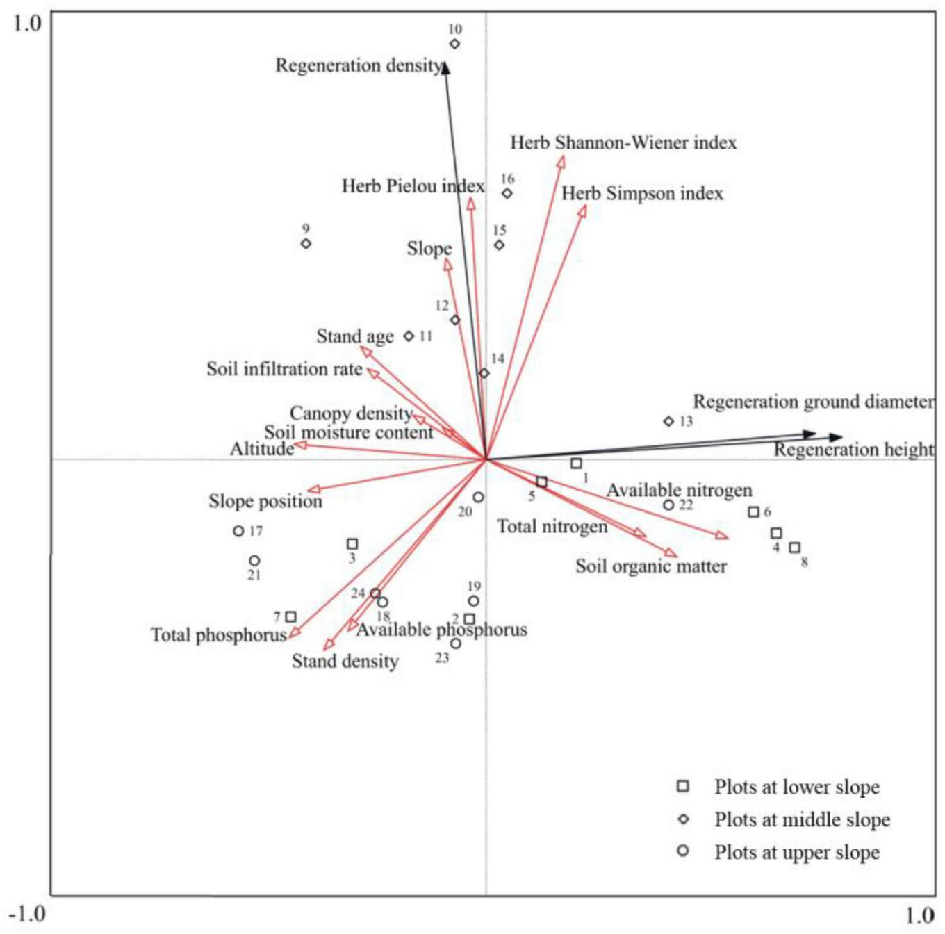 Redundancy analysis (RDA) was used to assess the relationship between soil moisture and nutrients at different slope positions and regeneration indicators (i.e., RGD, RH, and RD). The method can analyze the specific correlations between these variables and identify the factors responsible for the variation in the target variables. RDA was executed using SPSS 21.0 and CANOCO 5.0 software packages (Microcomputer Power, Ithaca, NY, USA), which allowed for the identification of significant variables and their respective contribution rates (CRs).