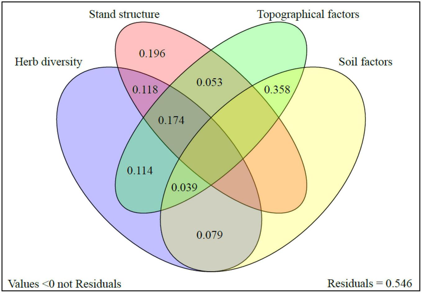 The Venn diagram displayed the independent and common contributions of each group of the environmental factors (Figure 7). The combined CR (0.358) of the topographical and soil factors was largest. The factors in the independent group of stand structure had the second larger contribution (0.196). In addition, there were some joint contributions that cannot be ignored among three groups of topographical factors, stand structure, and herb diversity, with the CRs of 0.174, 0.118, 0.114, and 0.053.