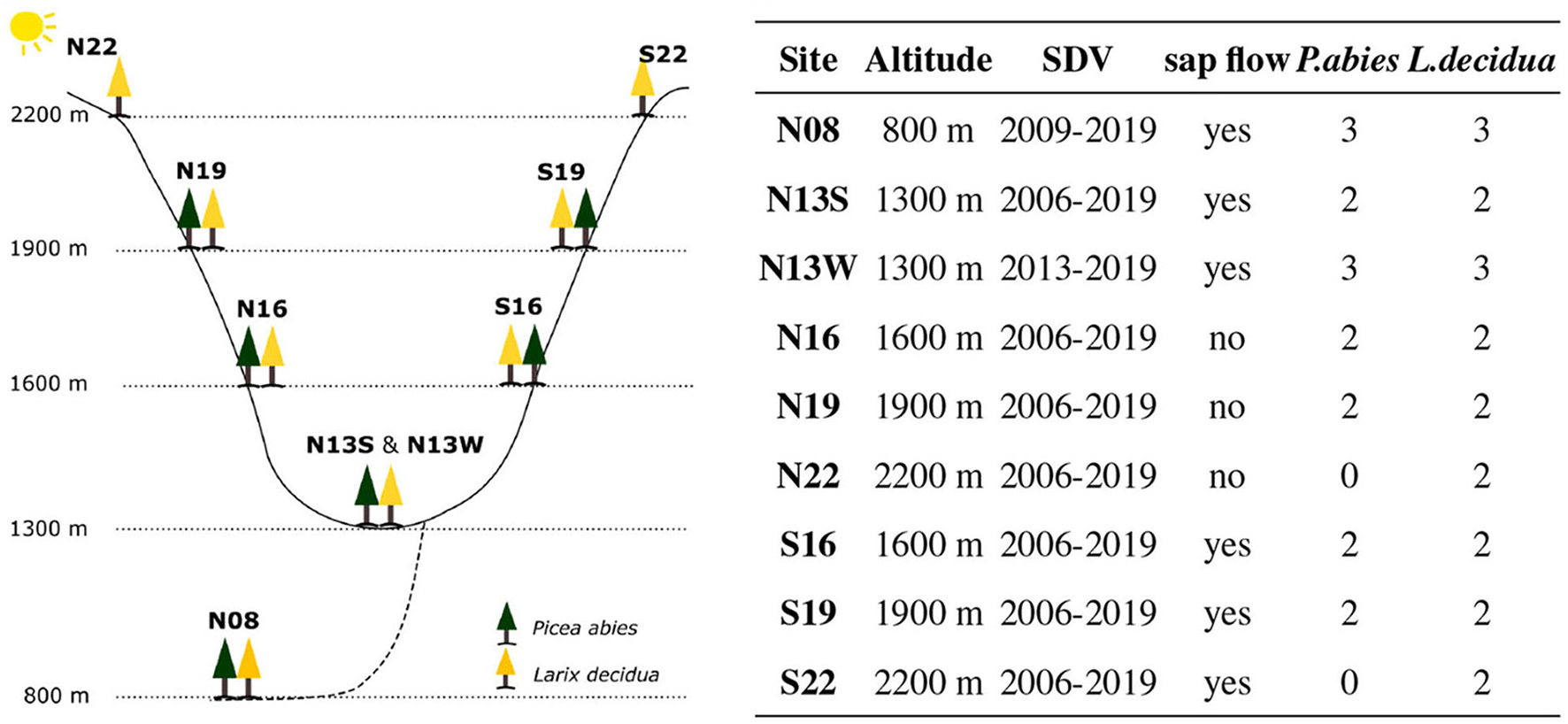 SDV were measured at the Lötschental tree-growth monitoring transect (Moser et al., 2010; King G. et al., 2013; King G. M. et al., 2013), which consists of 8 sites dispersed along two elevational transects of 900 meters (Figure 1) located in the Lötschental valley, Switzerland. An additional site is located just outside the valley at a lower altitude. At each site, four trees (sometimes 6) of both P. abies and L. decidua are equipped with point dendrometers. The Lötschental valley is a temperate alpine forest with a mean annual temperature of 5.7°C and a mean annual precipitation of 825 mm (King G. et al., 2013).