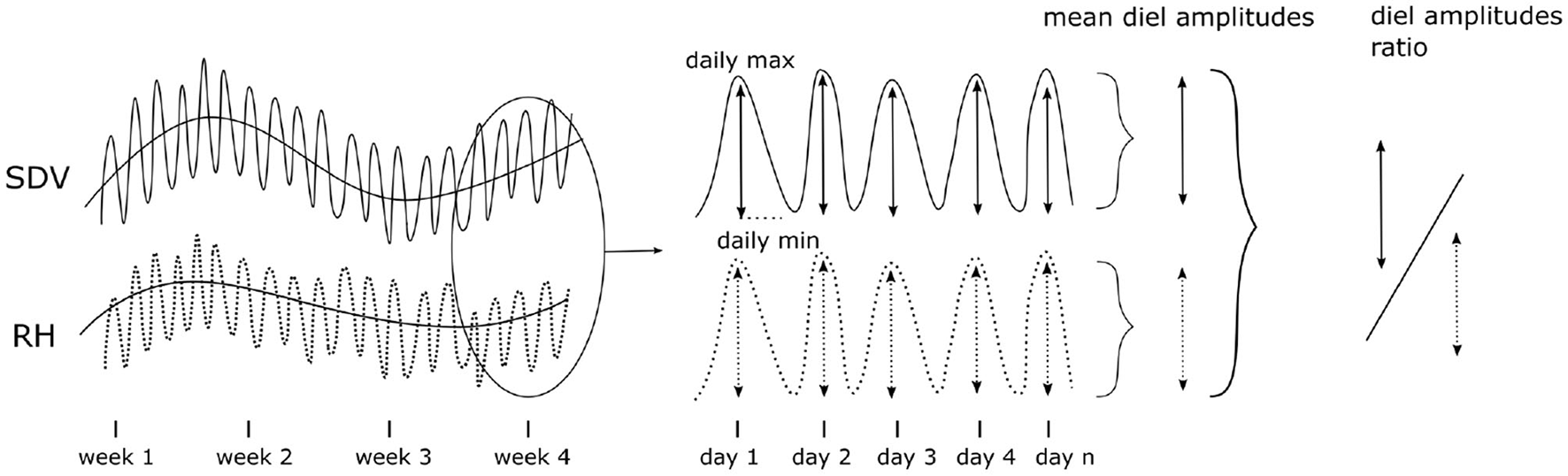 In this model, the seasonal differences of the distribution of the residuals are reduced but not completely evened out, meaning that some temporal correlation remains (Supplementary Figure 2). Residuals in winter tend not only to be on the negative side but also to express less variation, causing heteroscedasticity, noticeable between the lower values of the winter oscillations and the typical higher summer oscillations residuals. In this context, heteroscedasticity means that summer oscillations are given more weight in the model. We consider that this does not represent an important issue as the diel SDV amplitudes are more robustly coupled with the diel RH amplitudes in summer. Depending on the relative number of winter data points included in the model, there can also be a slight deviation to the normality of the residuals, especially at the highest and lowest values.