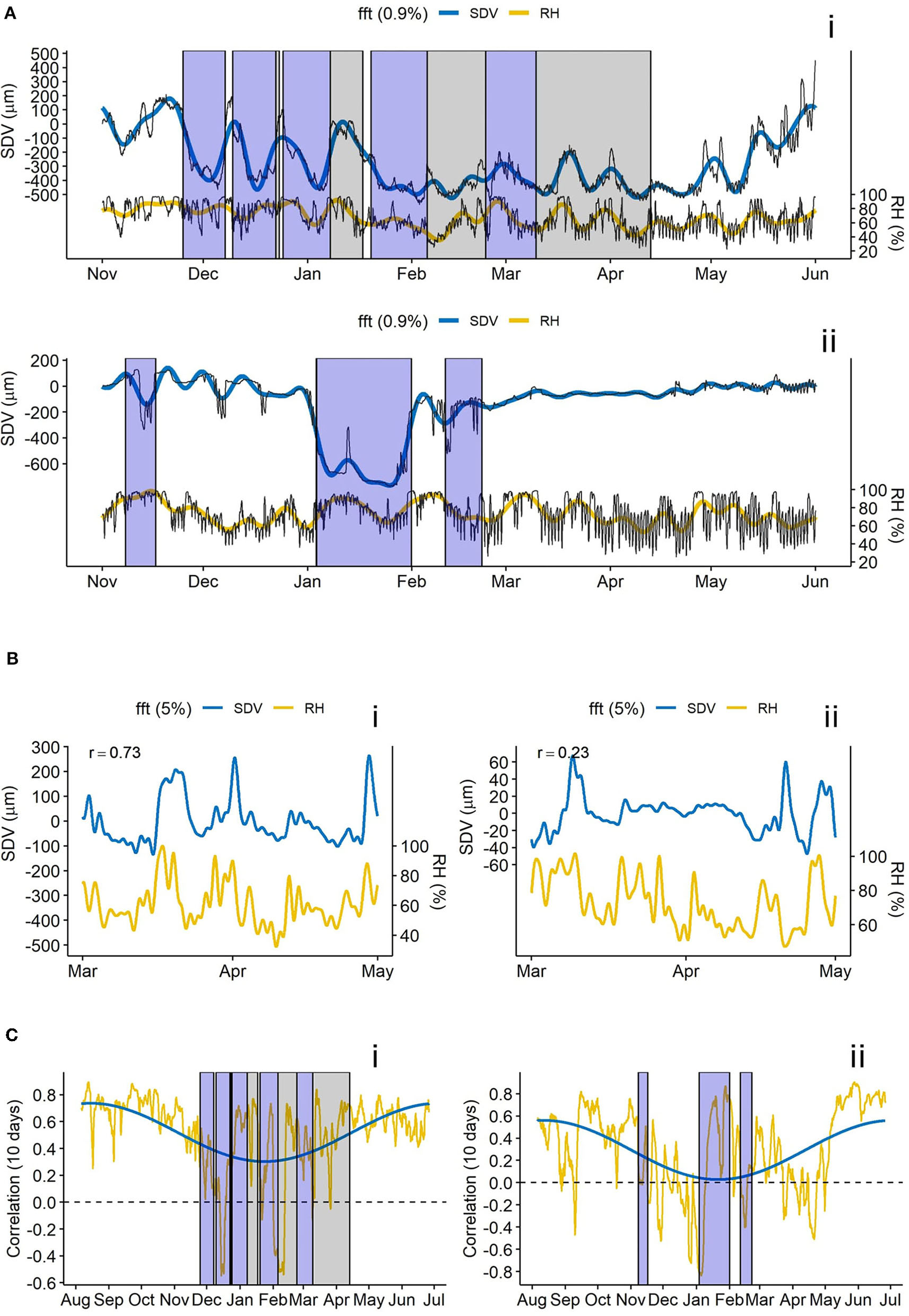 SDV - RH relations of the trees N16Ad_L2p (i = L. decidua, in 2010 - 2011) and N13Bd_L2p (ii = L. decidua in 2016–2017). (A) SDV and relative humidity with long term trend (fft, low pass filter of 0.9%). Blue boxes indicate freeze-thaw events, gray boxes indicate negative soil temperatures. (B) Detrended SDV fft and relative humidity fft (low pass filter of 5%). (C) 10 days rolling correlation for a year between SDV and relative humidity. Blue line shows the long term trend of the correlation (fft, low pass filter of 0.5%).