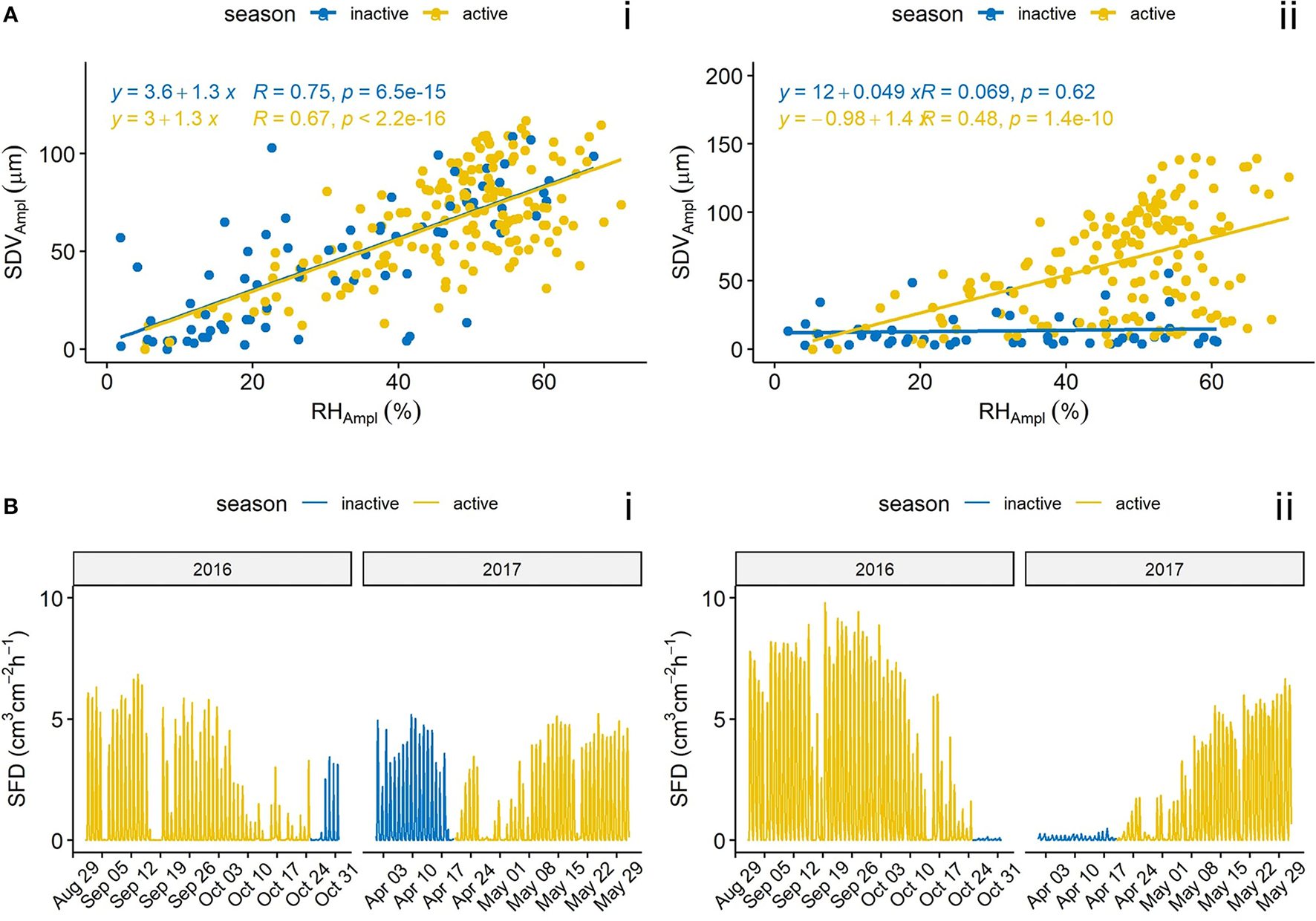 (A) Relation between the SDVAmpl and RHAmpl for the trees N13Wd_S2p (i, P. abies) and N13Wd_L2p (ii, L. decidua) during the winter of 2016–2017. (B) Sapflux density for the corresponding seasons. The inactive season was defined as the time period during which L. decidua is not transpiring (see section 2.3.3). R indicates Pearson correlation coefficient.