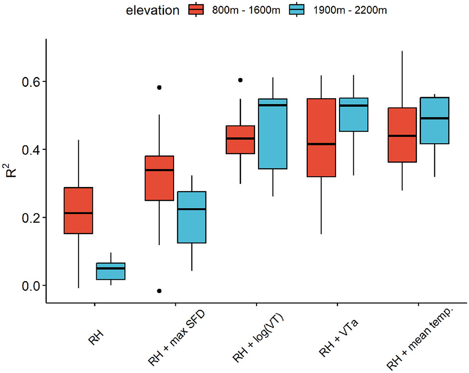 Overall, there is a clear relation between SDVAmpl and RHAmpl, but with significant differences in terms of season, species and altitude.For L. decidua, the inactivation of transpiration has a clear effect on the correlation between SDVAmpl and RHAmpl (Figures 6A, B). By adding transpiration variables, the linear models for SDVAmpl as function of RHAmpl could be distinctly improved (Figure 7). VT and diel mean temperature resulted in highest R2-values. The difference between high and low altitude trees in the RH model was drastically reduced by adding VT or diel mean temperature to the model.