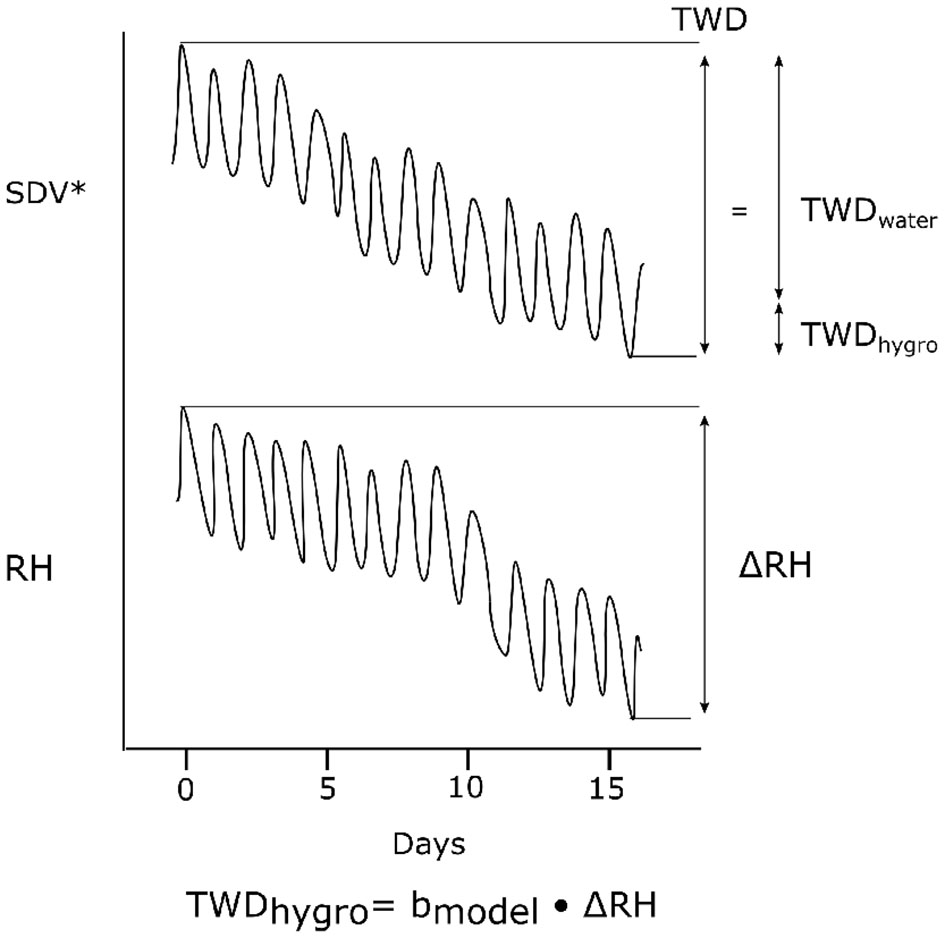 Suggestion of correction for TWD. TWD's amplitude is driven both by net water losses (TWDwater) and hygroscopicity (TWDhygro). TWDhygro can be calculated using the model. SDV* are growth-detrended SDV.