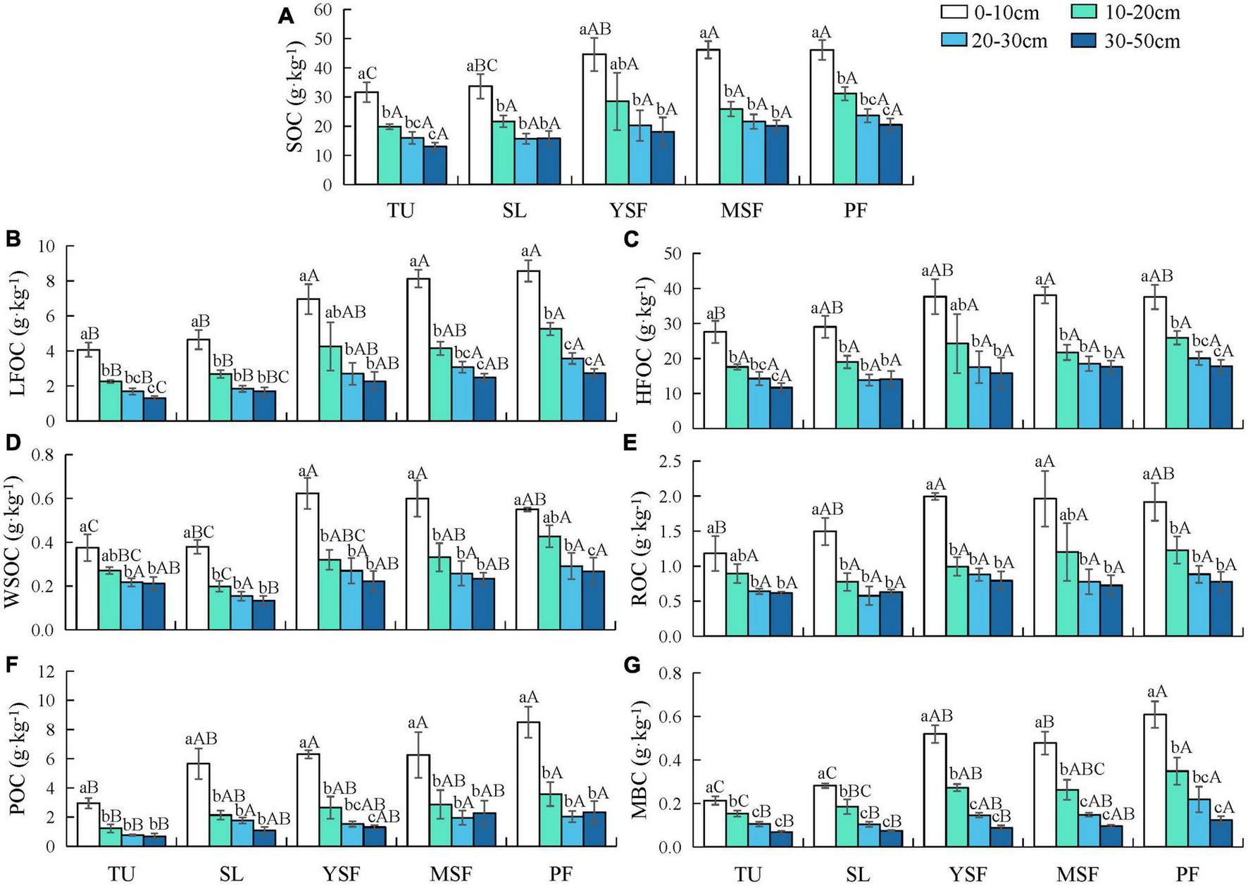 Distribution of (A) soil organic carbon (SOC), (B) light fraction organic carbon (LFOC), (C) heavy fraction organic carbon (HFOC), (D) water-soluble organic carbon (WSOC), (E) readily oxidizable organic carbon (ROC), (F) particulate organic carbon (POC), and (G) microbial biomass carbon (MBC) content in different vegetation restoration stages. TU, tussock, SL, shrubland, YSF, young secondary forest, MSY, mature secondary forest, PF, primary forest. Lowercase letters indicated significant differences amongst the same vegetation restoration stages of different soil layers, and capital letters indicated significant differences amongst different vegetation restoration stages in the same soil layers at the 0.05 level. Mean value ± standard error.