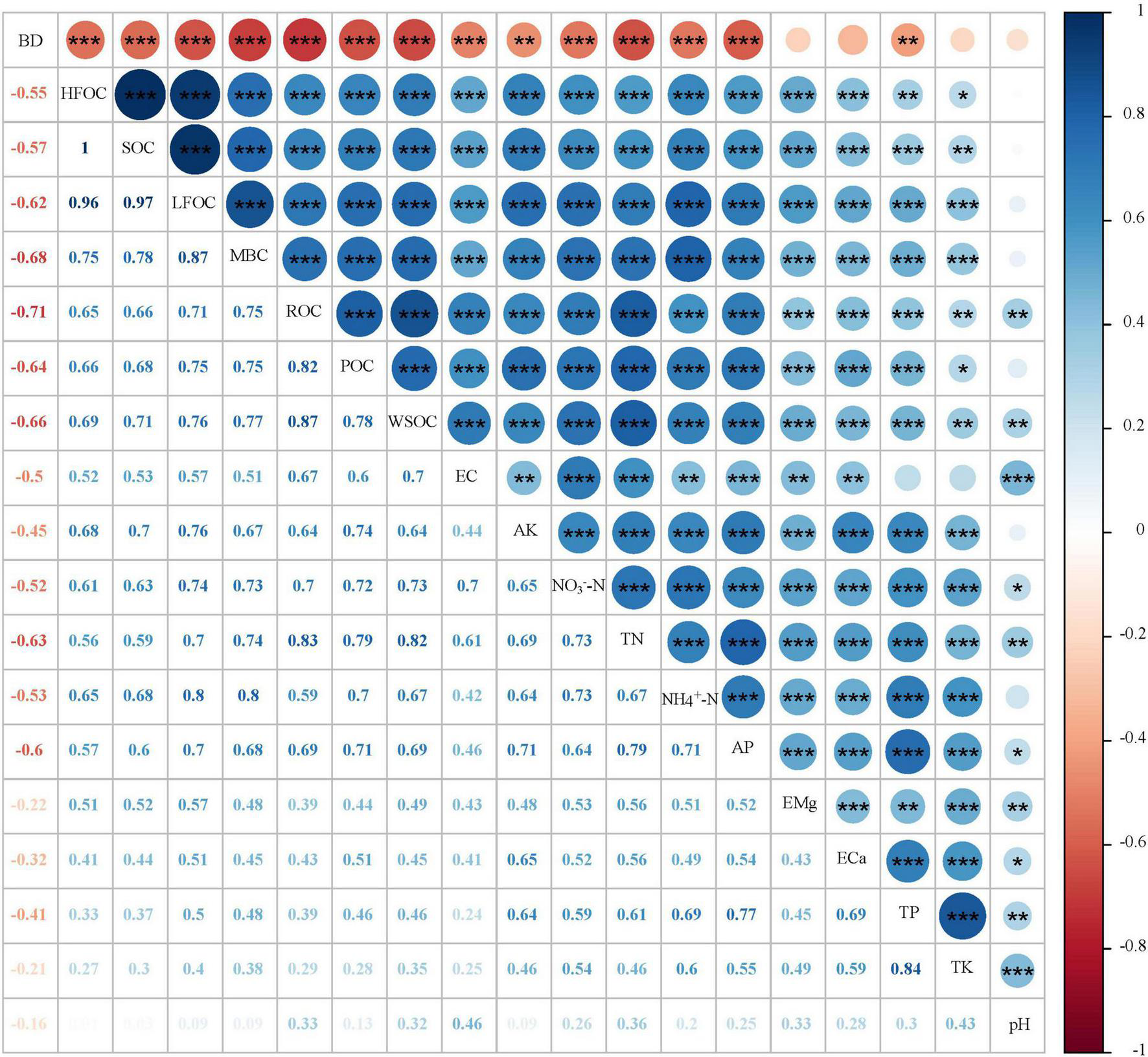SOC, soil organic carbon; LFOC, light fraction organic carbon; HFOC, heavy fraction organic carbon; WSOC, water-soluble organic carbon; ROC, readily oxidizable organic carbon; POC, particulate organic carbon; MBC, microbial biomass carbon. *p < 0.05, **p < 0.01, ***p < 0.001.