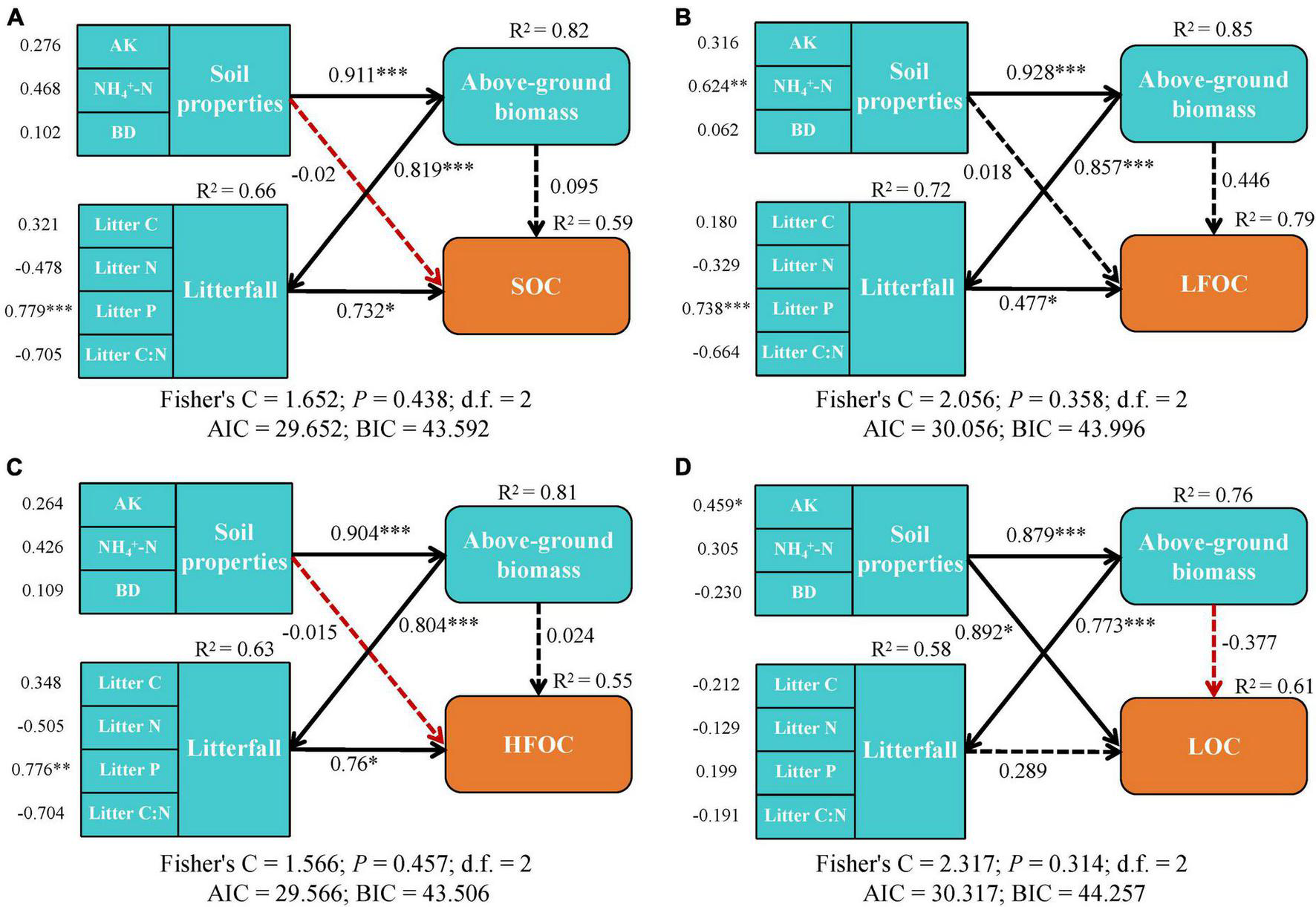 Two-way analysis of variance (ANOVA) was used to examine the effects of vegetation restoration and soil depth on the content of SOC and its fractions. Data were tested for chi-square and multiple comparisons between means using the least significant difference method at a significance level of 0.05. Pearson’s correlation analysis was used to analyze the correlation between soil physicochemical factors and SOC and its fractions. Redundancy analysis (RDA) was used to explore the main factors affecting SOC and its fractions and calculate the explanation rate of each environmental factor. Variables with a variance inflation factor (VIF) greater than 10 were removed by detecting multicollinearity among environmental factors before performing RDA. Structural equation modeling was used to further reveal the direct and indirect pathways through which regulatory factors influence changes in SOC and its fractions. Statistical data were expressed as mean ± standard error (mean ± SE). ANOVA was performed using SPSS (version 24.0; SPSS Inc., Chicago, IL, USA). The correlation analysis, RDA analysis, contribution of each explanatory variable, and construction of the structural equation model were based on the psych (Revelle, 2017), vegan (Oksanen et al., 2016), rdacca.hp (Lai et al., 2022), and piecewiseSEM (Lefcheck, 2016) packages in R 4.1.3, respectively.