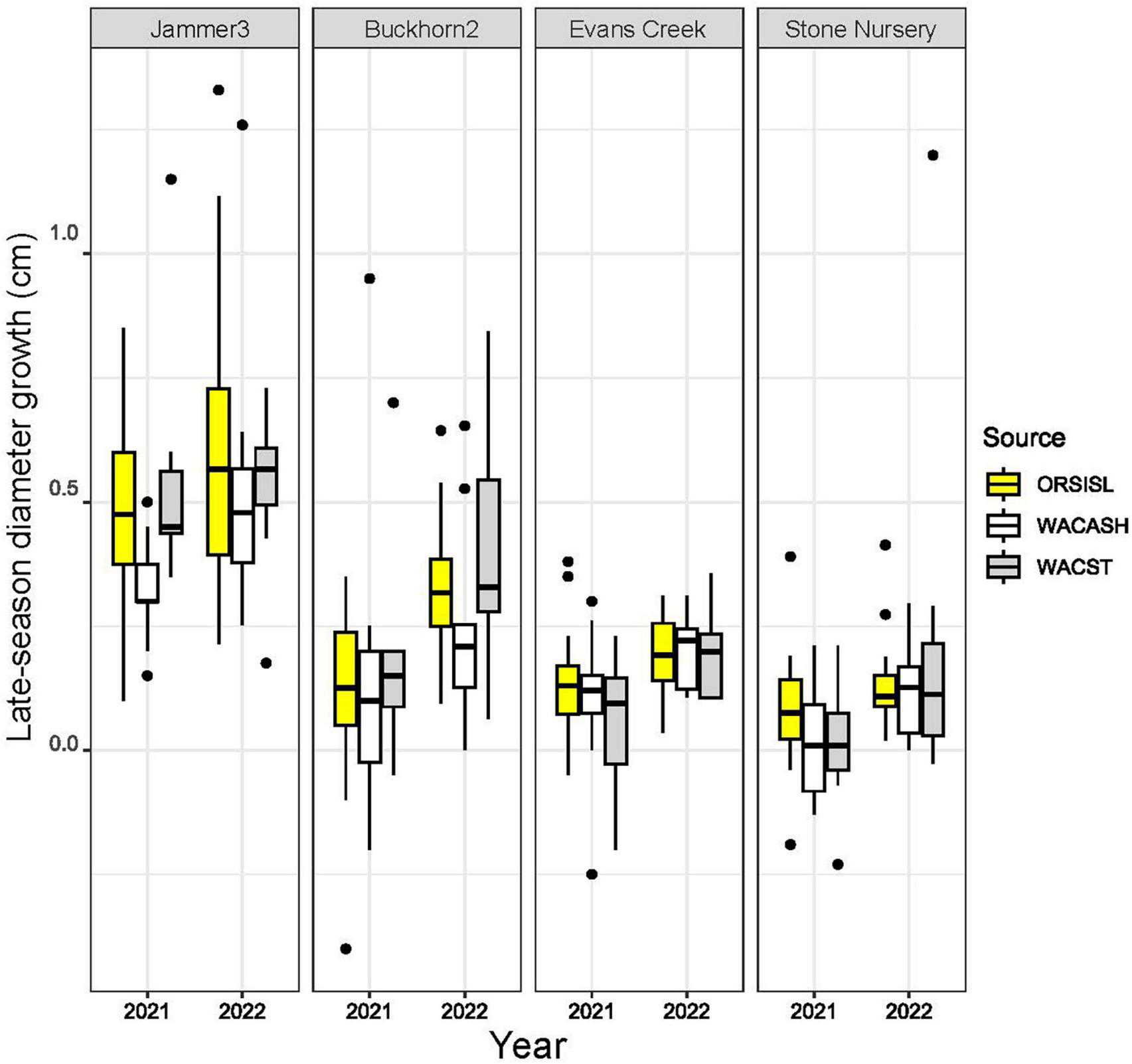 Boxplots of late-season diameter growth (in cm) from three provenances of Douglas-fir grown at four planting sites in 2021 and 2022. Late-season (early July to October) diameter changes in individual trees were made across two consecutive years following an extreme heat event in late June 2021. Boxplots show medians and interquartile ranges, with boxes colored by source provenance; mean values are provided in Table 3. Late-season growth was highest at cooler/wetter sites (e.g., Jammer3), and growth was lowest at warmer/arid sites (Evans Creek, Stone Nursery). Median and mean values were higher in 2022 relative to 2021 across all planting sites, with the largest differences observed at sites that were exposed to air temperatures exceeding 42°C (Buckhorn2, Evans Creek, Stone Nursery).