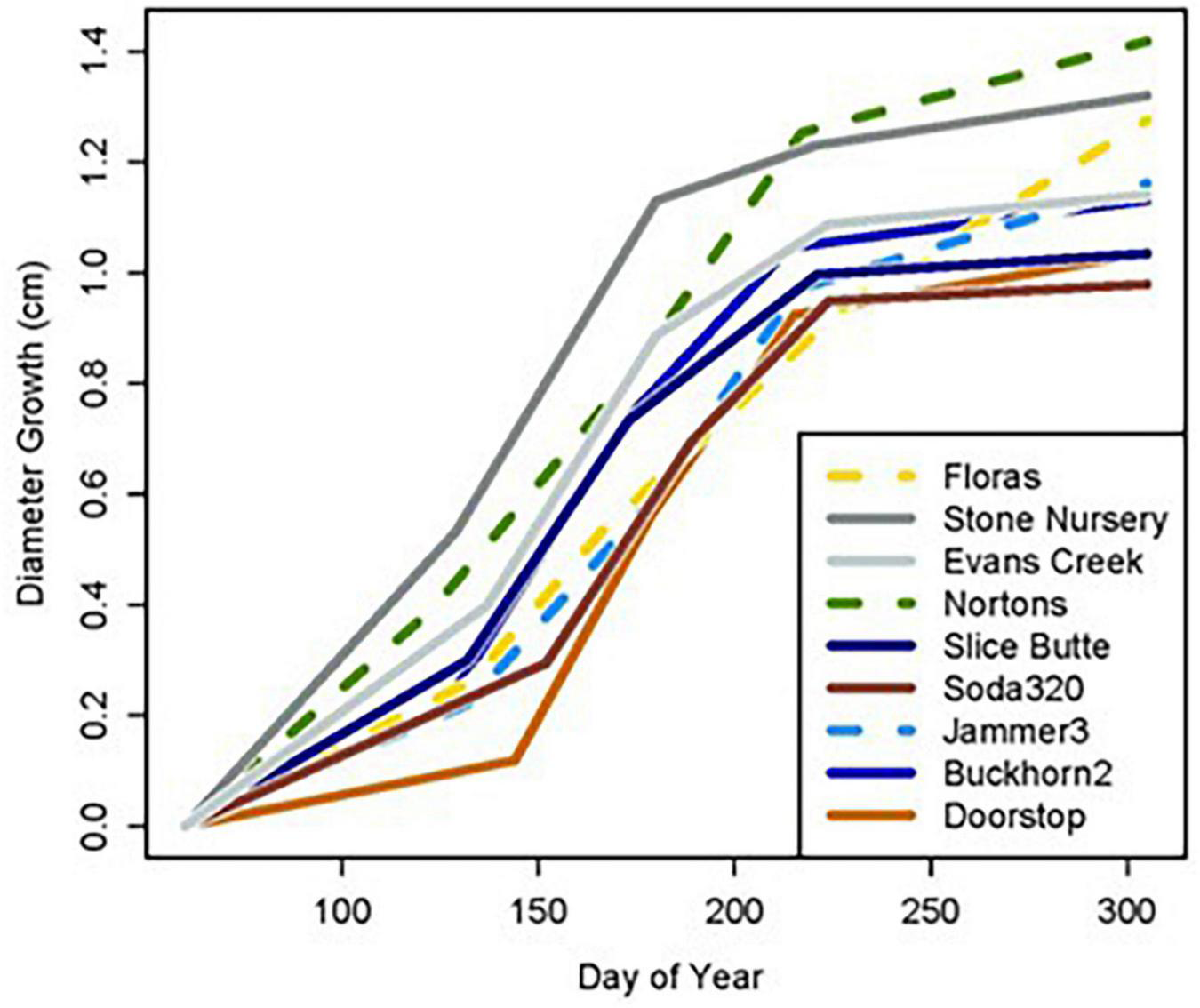 Diameter growth of woody plants responds to temperature, photoperiod, moisture and other factors and phenological events such as the beginning of growth in the spring or growth cessation in the fall are tied to these factors (Fritts, 1976; Kramer and Kozlowski, 1979; Oliver and Larson, 1990; Ford et al., 2016, 2017; Taiz et al., 2022). Growth rates are also influenced by genotypic differences in phenology, local site conditions, and biotic and abiotic factors such as genotype susceptibility to insects and diseases or unusual heat or freeze events, droughts, or windstorms and many studies have examined factors influencing diameter growth. Douglas-fir (Pseudotsuga menziesii) is a major tree species in terms of its ecological and economic importance and many studies have examined factors influencing its diameter growth (St. Clair et al., 2005; Lavender and Hermann, 2014). Most studies of diameter growth by foresters focus on the effects of age, stand density, silvicultural practices, and site conditions (Talbert and Marshall, 2005; Curtis et al., 2007). These studies typically use natural stands or plantations with only one seed source and they have not been designed to evaluate the contributions of seed source or seed source-planting site interactions on diameter growth.