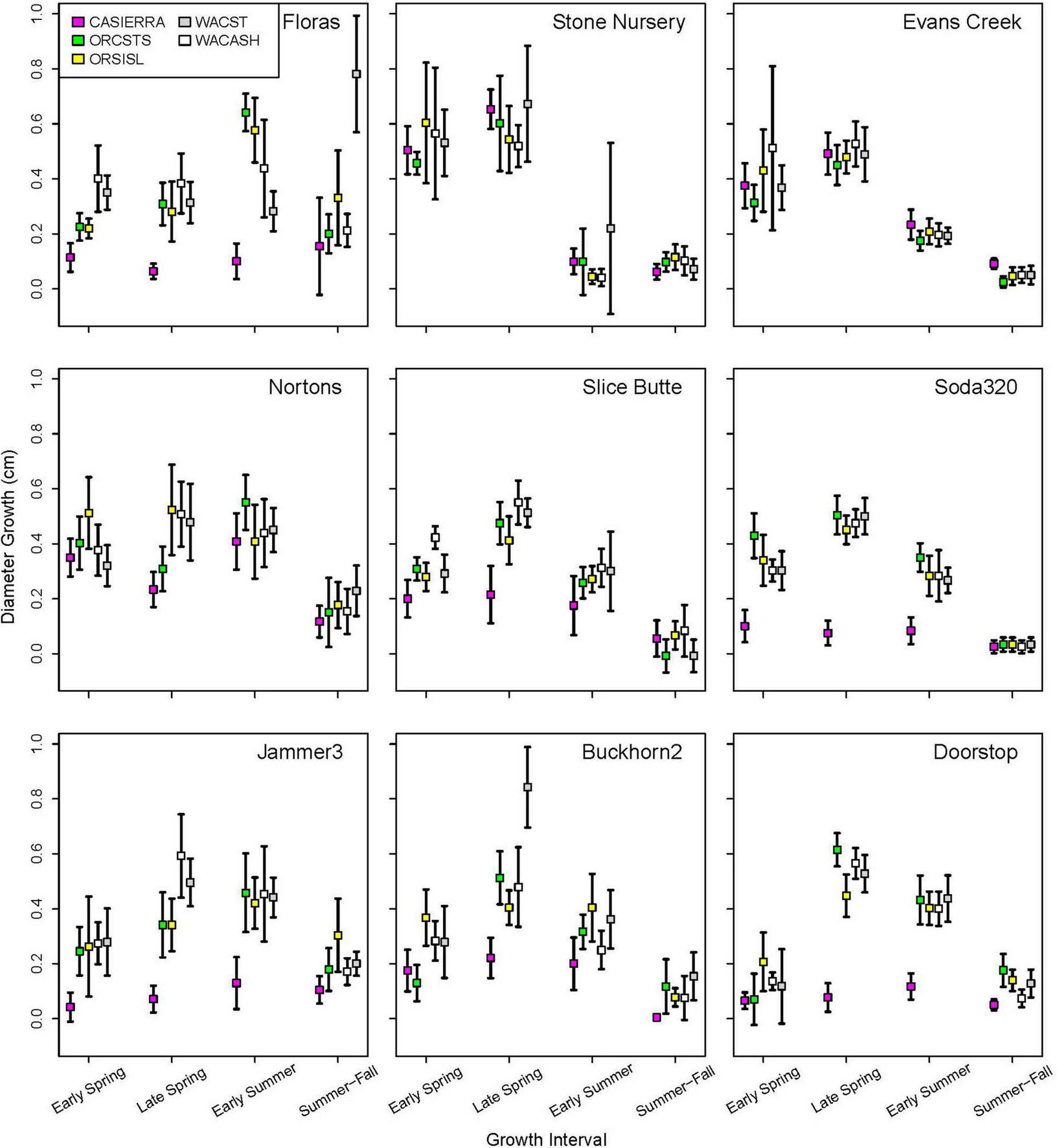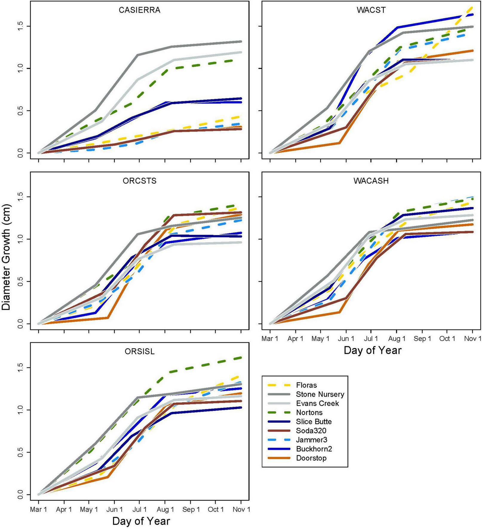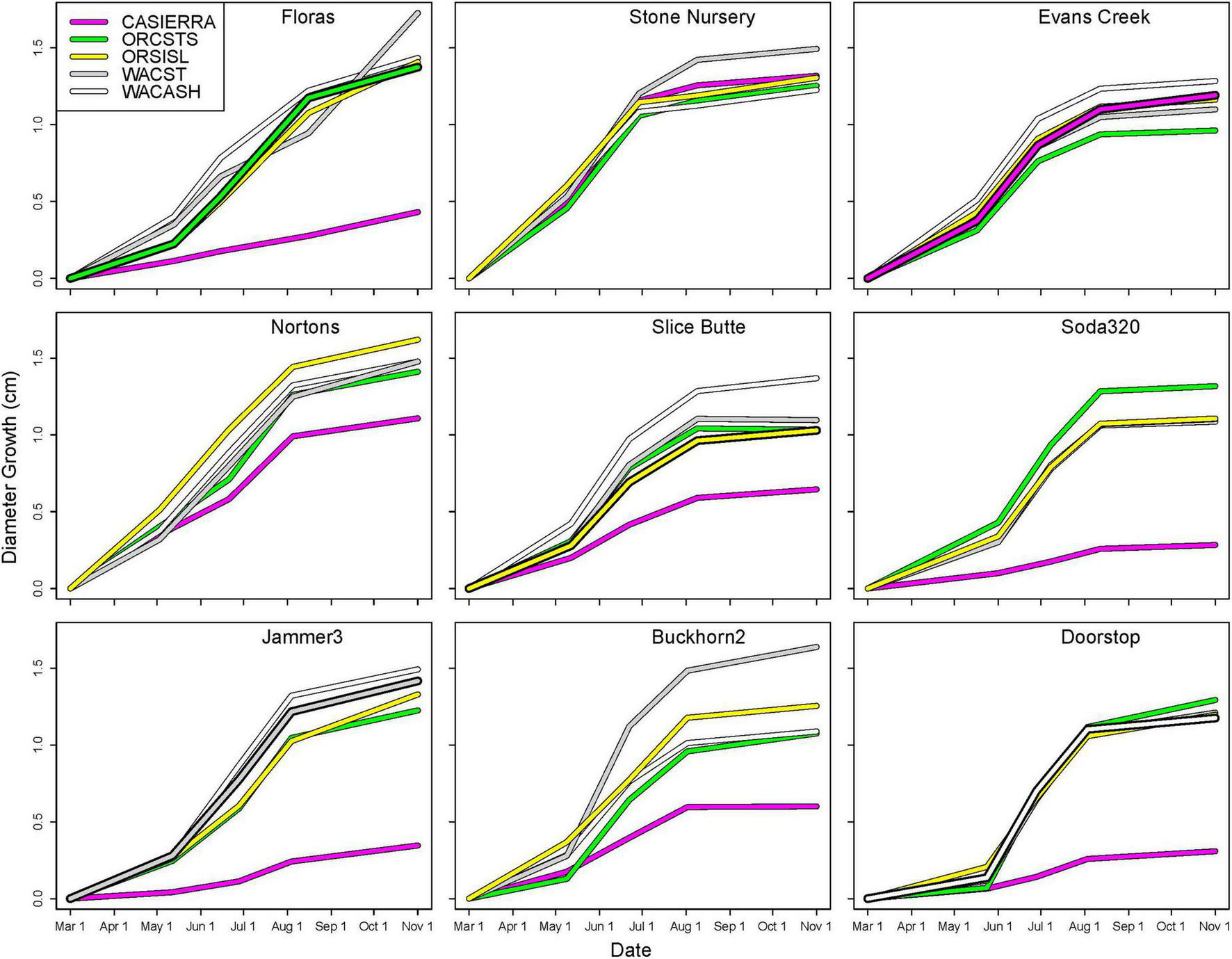 Cumulative diameter growth during the 2022 growing season by planting site and provenance. Figure panels are arranged vertically from south to north and horizontally from coast to low-, to high-elevation inland sites. The provenance that would be closest to the climate of the planting site is shown as a bold line (ORCSTS for Floras, CASierra for Evans Creek, ORSISKL for Slice Butte, WACST for Jammer3, and WACASH for Doorstop).