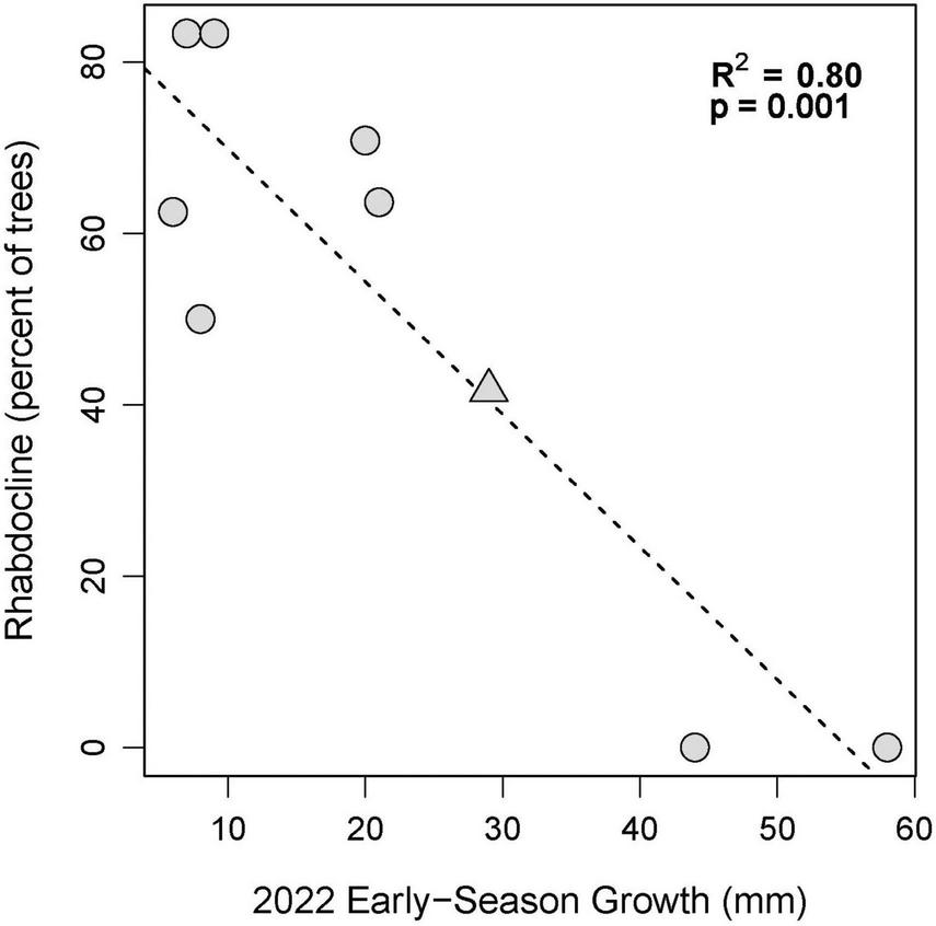 Early season growth (Spring and Early Summer) in 2022 versus the percentage of trees per site coded as having moderate to severe Rhabdocline in 2015 based on surveys by Wilhelmi et al. (2017). The Nortons site is indicated with a triangle.