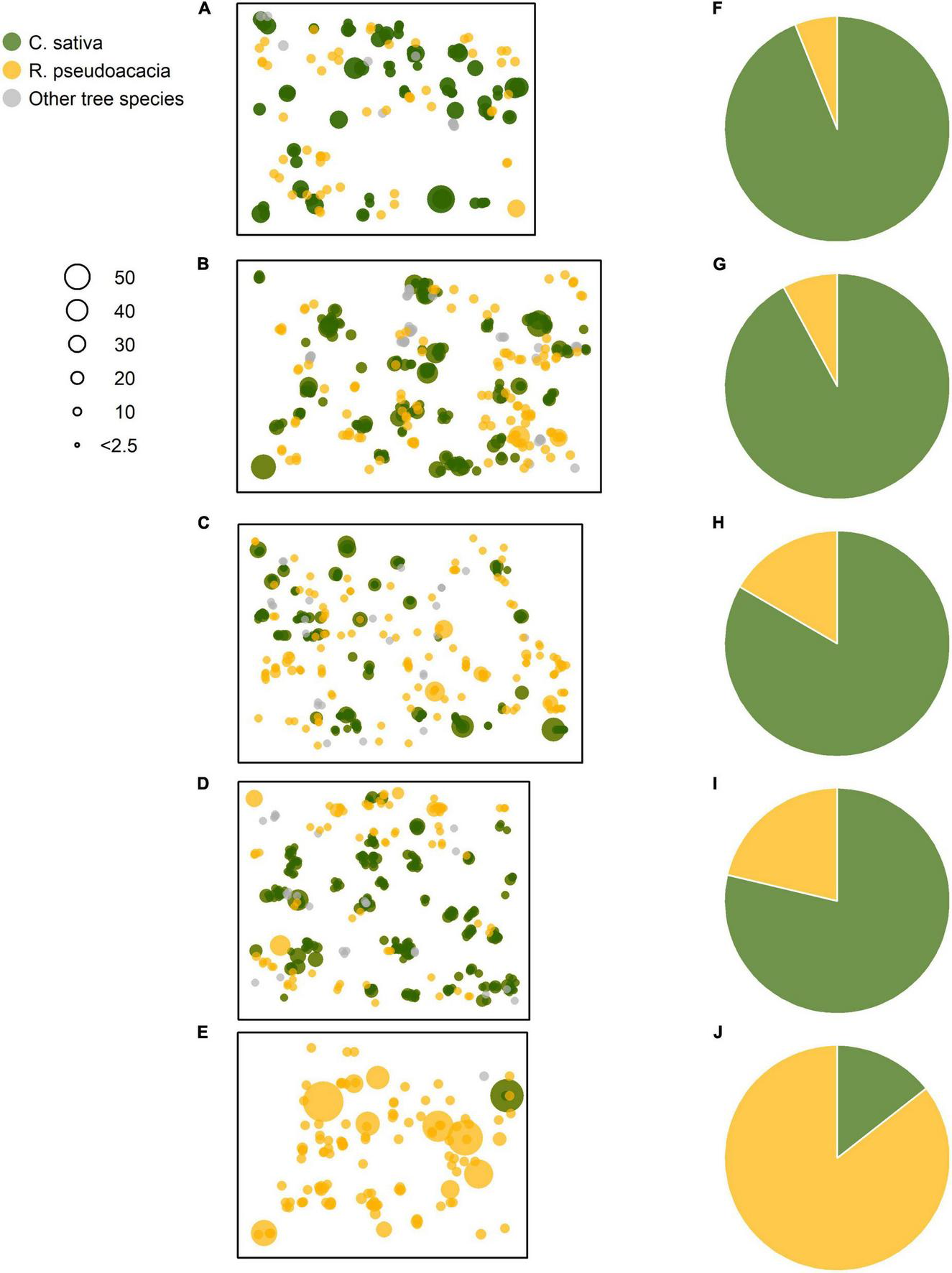 Spatial distributions of the sprouted stems and their sizes for the Castanea, Robinia, and other Mediterranean tree species. (A–E) The plots were ordered by decreasing basal area values of the standing Castanea sprouts belonging to the overstory layer. (F–J) Represent the basal area percentage (%) for the Castanea and Robinia sprouts belonging to the overstory layer. Point sizes are proportional to diameter at breast height (DbH, cm). (A–E) Correspond to the plots C1–R5 of Table 1.