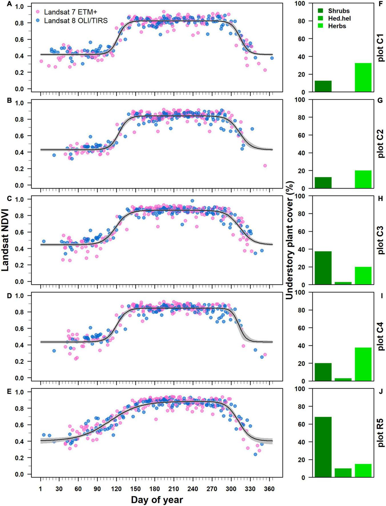 Pixel-based Landsat NDVI trajectory for Castanea and Robinia coppice forest stands. (A–E) The NDVI trajectories were ordered by decreasing basal area values for the standing Castanea tree sprouts belonging to the overstory layer. Each black line represents the Back double logistic function fitted to NDVI values derived from both Landsat 7 ETM+ (blue points) and Landsat 8 OLI/TIRS (pink points) satellites. Gray bands represents 95% confidence intervals. (F–J) Show the percentage cover of understory species: shrub species (shrubs), Hedera helix subsp. helix (Hed.hel) and herbaceous species (Herbs).