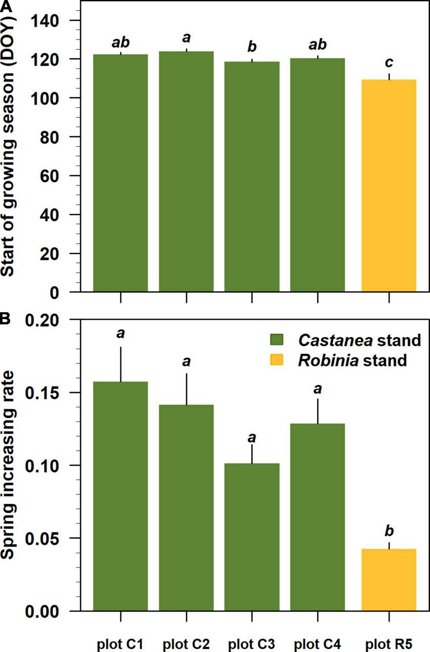 Spring phenological parameters estimated for each stand dominated by Castanea and Robinia trees sprouts. From plot C1 to plot R5, phenological parameters were ordered by decreasing basal area values for the standing Castanea tree sprouts belonging to the overstory layer. In each panels (A,B), lower case letters indicate significant differences at p-level < 0.05 following Tukey’s multiple comparison test. Black vertical bars represent the standard error of the estimates.