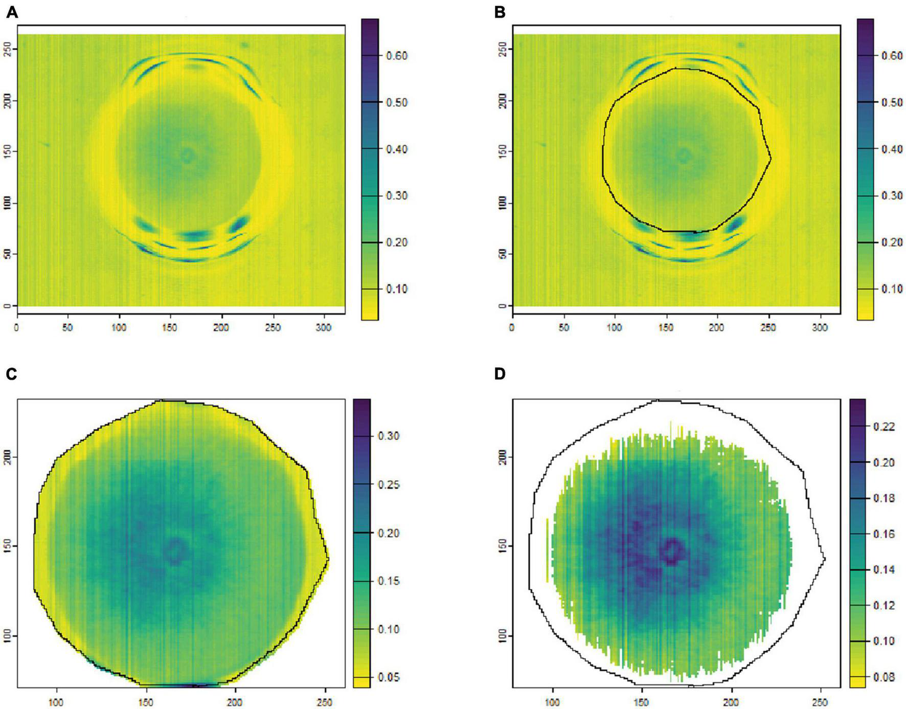 To remove the background noise and generate clean fungal colony images, as shown in Figures 1, 2, only the culture medium within the petri dish was selected by hand and marked as an area of interest (ROI). Then, the reflectance values at 649.6 nm for VNIR and 1,588 nm for SWIR were used to discriminate between the culture medium and fungal colonies. Thus, threshold values (below 0.1 for VNIR and greater than 0.07 for SWIR) were used to segment the regions of fungal growth from the culture medium as shown in Figures 1, 2.