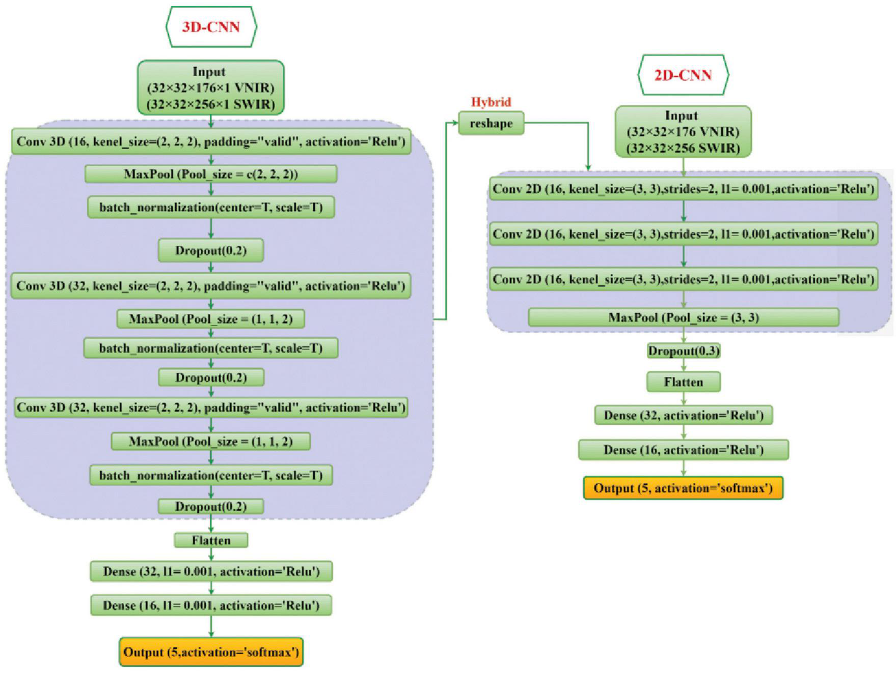 The overall framework of the 2D-CNN, 3D-CNN, and hybrid 3D-2D-CNN model. For VNIR images the used input layer is (32 × 32 × 176 × 1) and for SWIR images the input layer is (32 × 32 × 256 × 1).