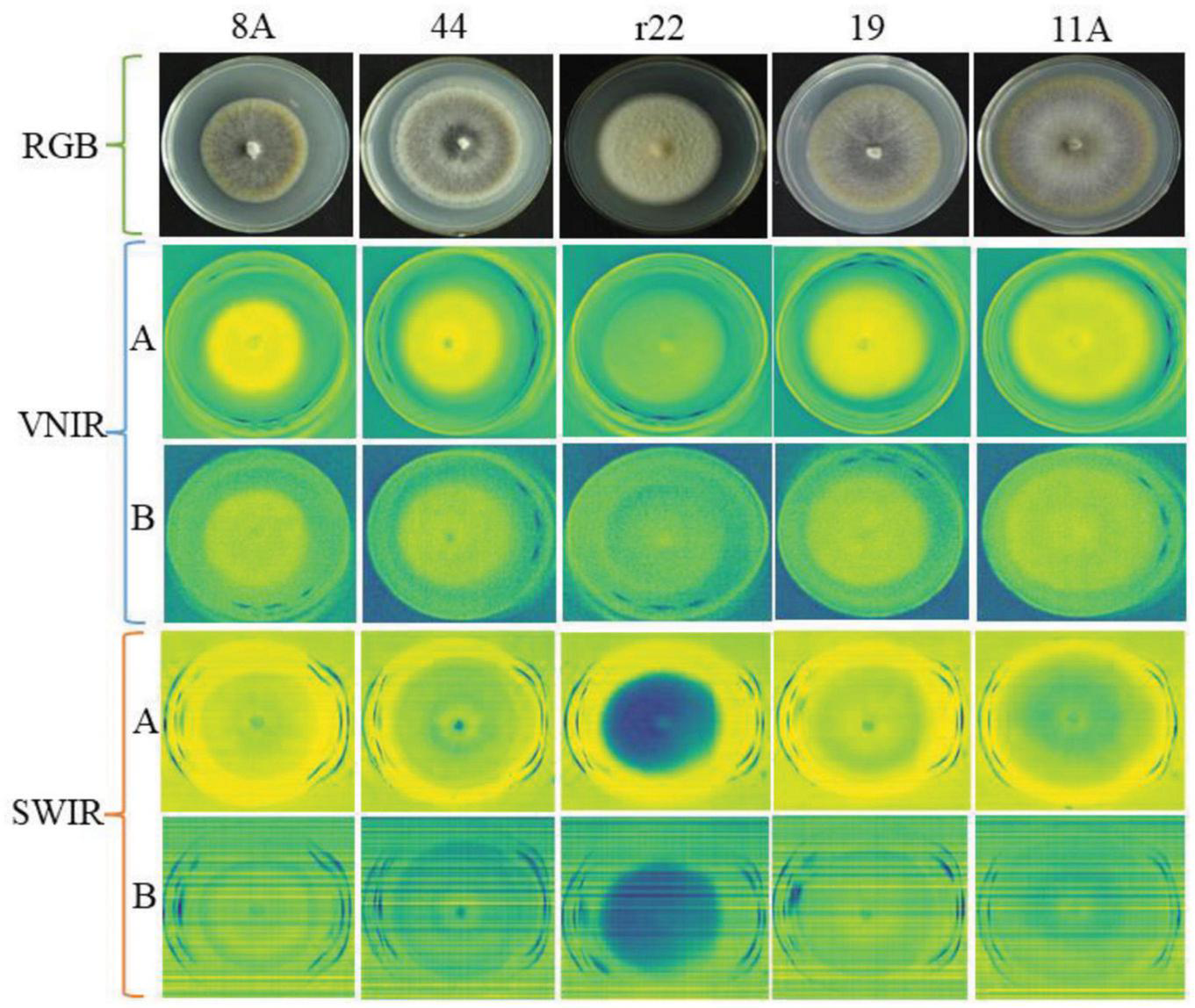 The RGB, VNIR, and SWIR images of five fungal colonies (named 8A, 44, r22, 19, 11A) in the same growth stage (day 10). For VNIR and SWIR images, (A) images using the optimal raw spectral band; (B) images using the bad raw spectral band.