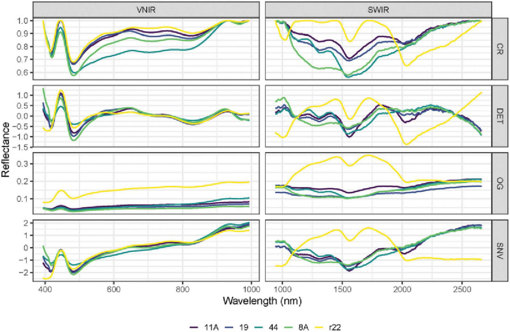 The mean raw (original) spectra of VNIR and SWIR, and various preprocessing techniques of the five fungi (8A, 44, r22, 19, 11A). OG: original spectra; CR: continuum removal spectra; DET: De-trending spectra; SNV: standard normal variate.