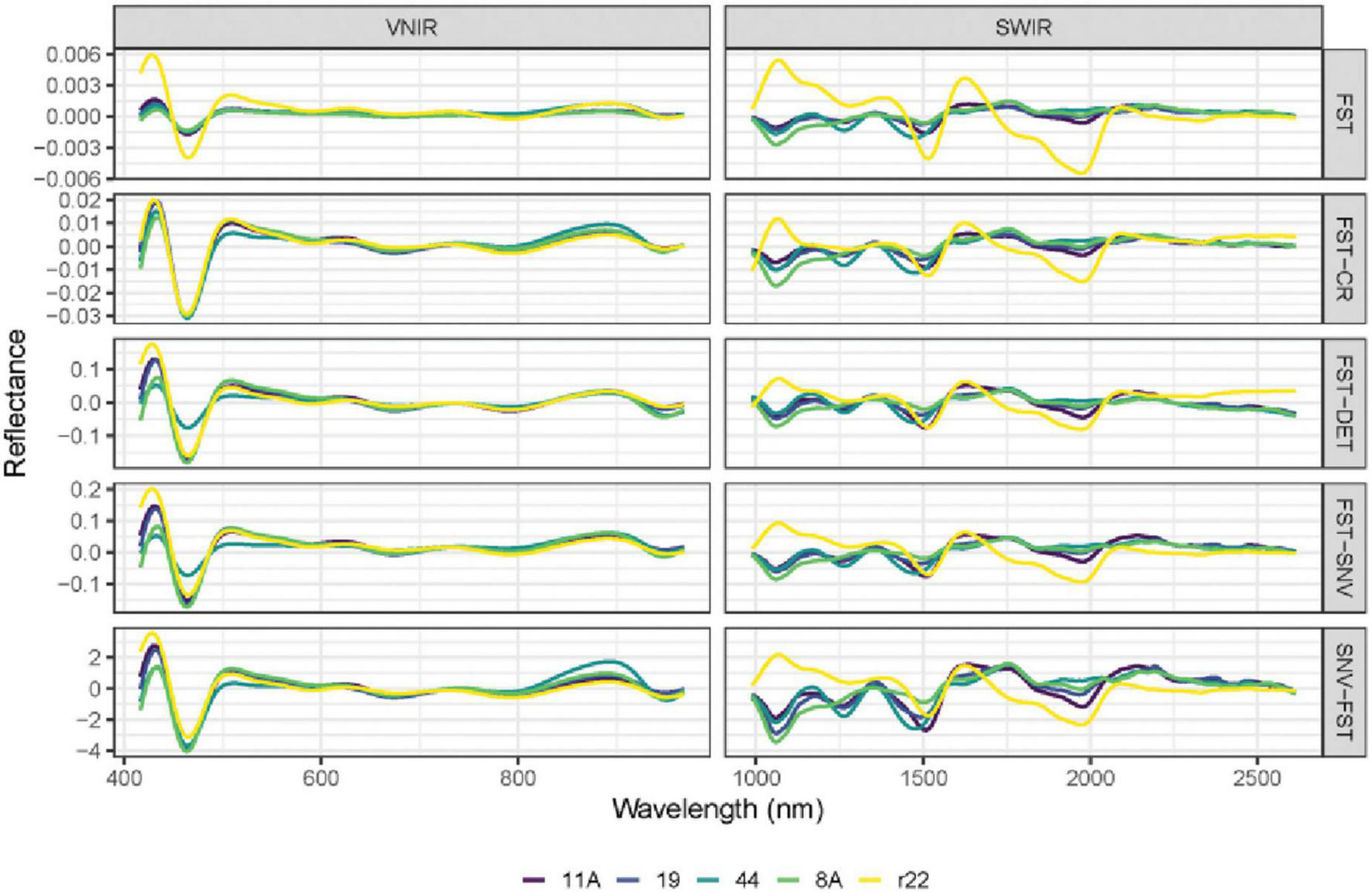 The mean spectra of VNIR and SWIR after combining different preprocessing techniques of the five fungi (8A, 44, r22, 19, 11A). FST: The first derivative; FST-CR: The first derivative combined with continuum removal spectra; FST-DET: The first derivative combined with De-trending spectra; FST-SNV: The first derivative combined with standard normal variate spectra; SNV-FST: SNV combined with the first derivative spectra.
