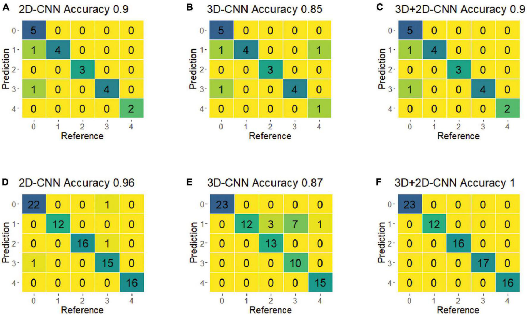 All of the CNN models (i.e., 2D-CNN, 3D-CNN, and 3D-2D hybrid CNN) were trained using the Adam optimizer (Loshchilov and Hutter, 2017) with the categorical_crossentropy loss function. The batch size and epochs were set to 32 and 300, respectively.