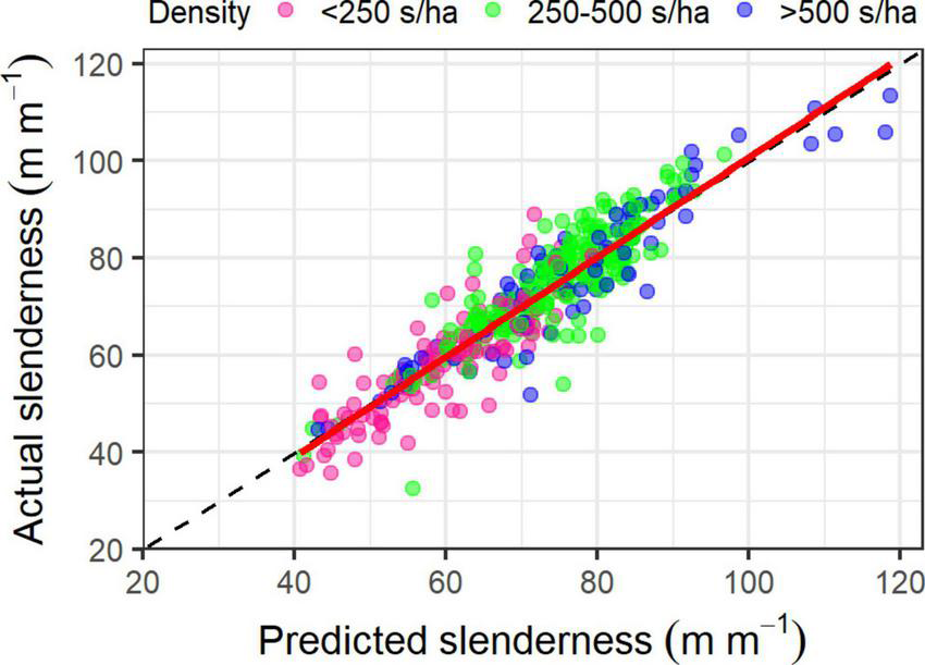 The cross-validation on the training dataset had an R2 of 0.93, RMSE of 3.82 m m–1 and MBE of −0.035 m m–1. Predictions of slenderness from this model using the withheld test dataset were accurate and unbiased, with an R2 of 0.85, RMSE of 5.56 m m–1 and MBE of −0.12 m m–1. A plot of predicted against actual slenderness using the test dataset showed little apparent bias across the range of predicted values or with respect to stand density (Figure 2). Residual slenderness was also relatively unbiased when plotted against predicted values or any of the four variables in the final model (data not shown).